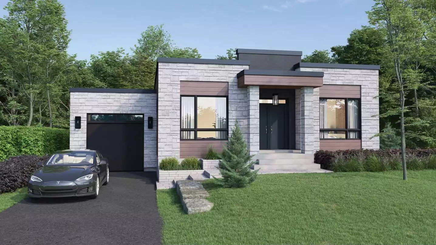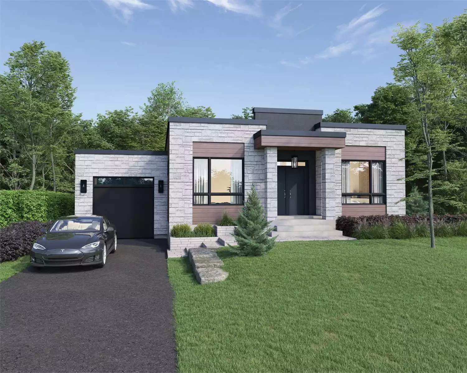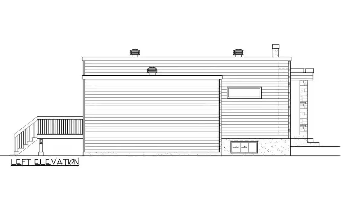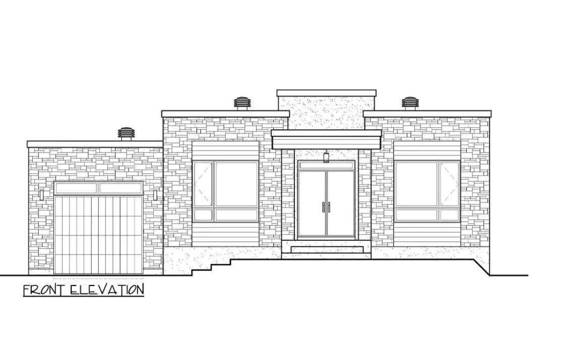 Perfect for urban neighborhoods with its sharp modern style, House Plan 8797 is a small modern ranch with flat rooflines, large windows, and a simple shape to keep building costs in check. Inside, you'll find 1,208 square feet with two bedrooms, one bathroom, and open-concept living, while a one-car garage on the side provides handy off-street parking. The layout places the bedrooms in front, with one off the foyer area and the other accessible on the other side of the wall with the entry coat closet, laundry, and walk-in pantry. The great room with an island kitchen overlooking living and dining areas fills out one back corner while the four-piece bathroom is in the other. The garage can be found down a few steps, and then the staircase continues down to the unfinished basement that you can make your own!