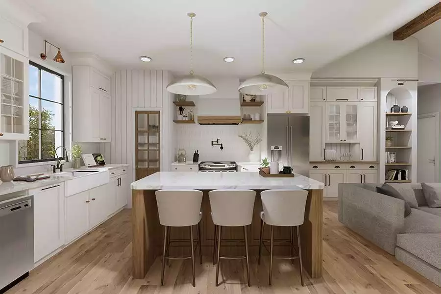 If you're looking for a beautiful, modestly sized home for a family, consider House Plan 2805! This adorable one-story cottage offers 1,612 square feet with open living, four grouped bedrooms, and two bathrooms. When you enter, a thoughtful foyer with a closet on one side and a bench on the other welcomes you home. An arched doorway leads to the great room, where you'll enjoy a vaulted living space with a fireplace in front and an island kitchen overlooking the dining area in back. The hallway to the side includes all four bedrooms. There's one bedroom with front windows and two with back windows while the primary suite is placed on the side, complete with its own walk-through closet and private five-piece bath. The secondary bedrooms share a central three-piece hall bath. The laundry is tucked through an arched doorway in the hall bathroom. This is a perfectly balanced home for growing families!
