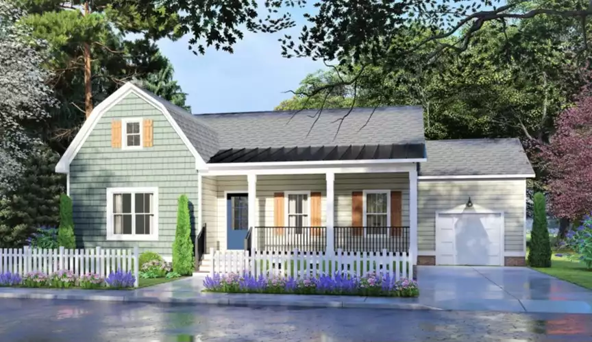 If you're looking for an adorable cottage with traditional curb appeal, give House Plan 10775 a try! This lovely one-story home has a gambrel roofline on one side and a covered front porch on the other to create good, old-fashioned style. There's also a single-bay garage on the side with front entry---perfect if you need front access but don't want the garage to grab attention! Inside, you'll appreciate 1,656 square feet with three bedrooms and two bathrooms. The beds and baths are grouped in one hallway off the entry area along with the laundry room for convenience. Opposite this, the open-concept great room spreads back from the vaulted living area in front to the island kitchen in back. There's also a mudroom behind this that connects to the garage and back door.