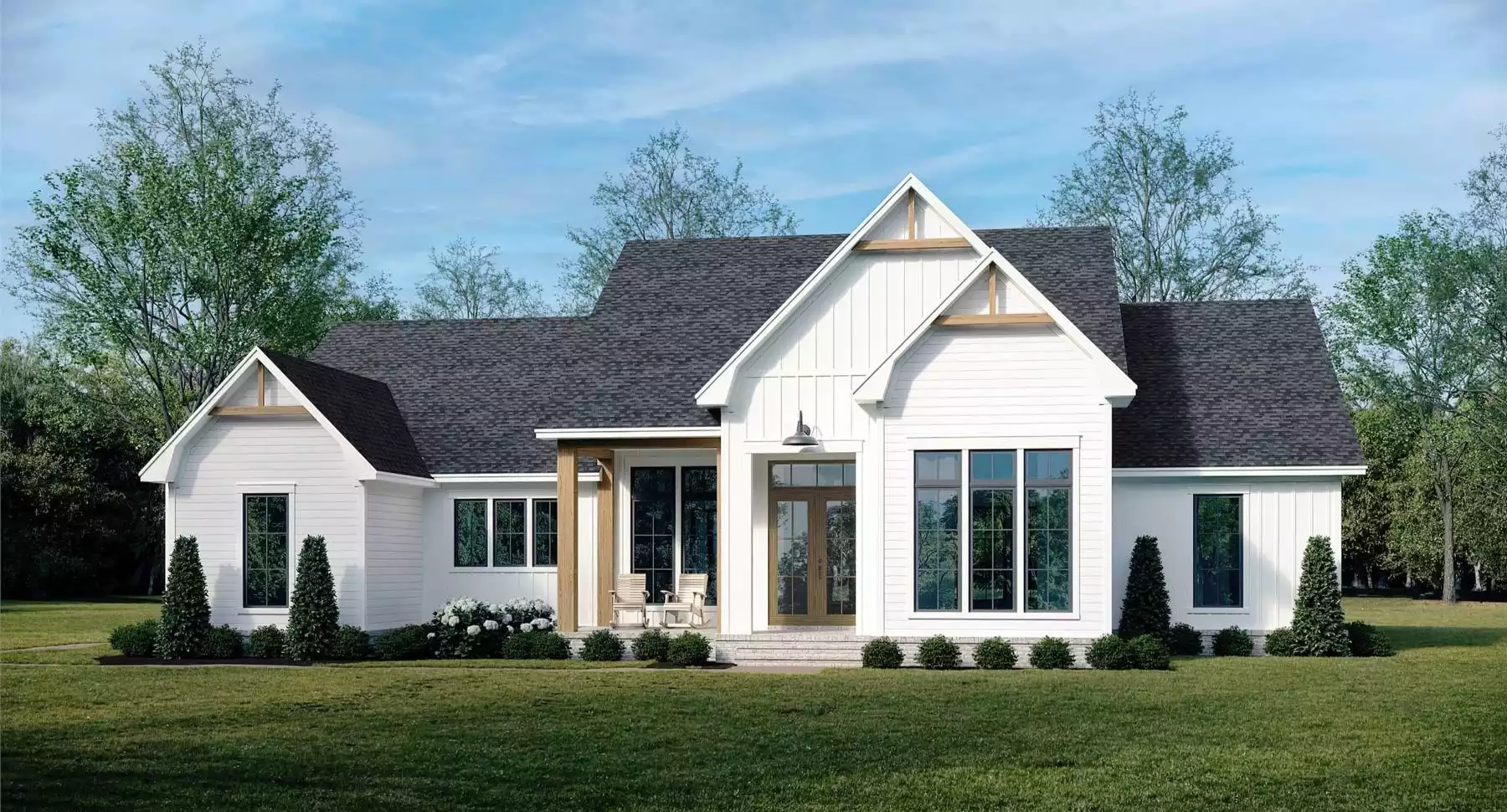 Looking for a great cottage with modern appeal inside? See what House Plan 9374 has to offer! This one-story layout boasts 2,397 square feet with porch space in front and back to expand potential. When you first enter, the totally open-concept common areas welcome you inside. The great room features a beamed ceiling, the dining area is very slightly defined with wide cased entries, and then you'll find a U-shaped island kitchen at the far end. There's also an office with front views off the great room while the primary suite and its five piece bath are tucked away in back. Two secondary bedrooms and a hall bath to share are placed behind the kitchen. Make sure to notice all the convenience of the entry area coming in from the garage--it includes the laundry room, pantry, storage built-ins, and the powder room!
