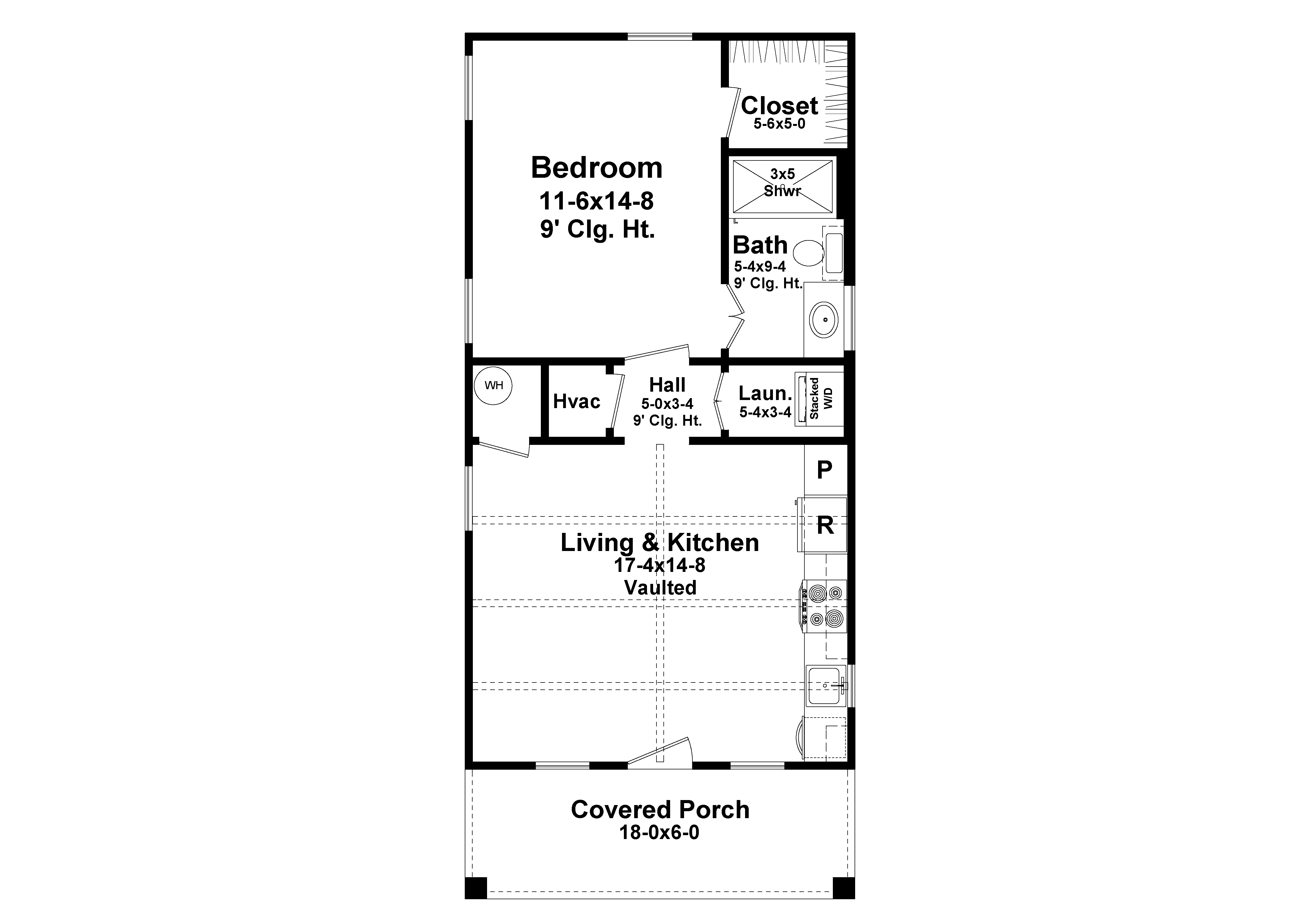 Whether you're just starting out, looking to downsize, or want to add an ADU to your property, give House Plan 10539 a try! This affordable cottage has a perfectly rectangular footprint and a single gable roof to keep costs down. Inside, you'll find 612 square feet with totally open living in front and one bedroom and one bathroom in a suite arrangement in back. The great room has a one-wall kitchen and a cathedral vaulted ceiling across the entire space. The short hallway to the bedroom includes a closet with stacked laundry. The suite offers a three-piece bath with a stall shower and a walk-in closet. What an efficient little design!