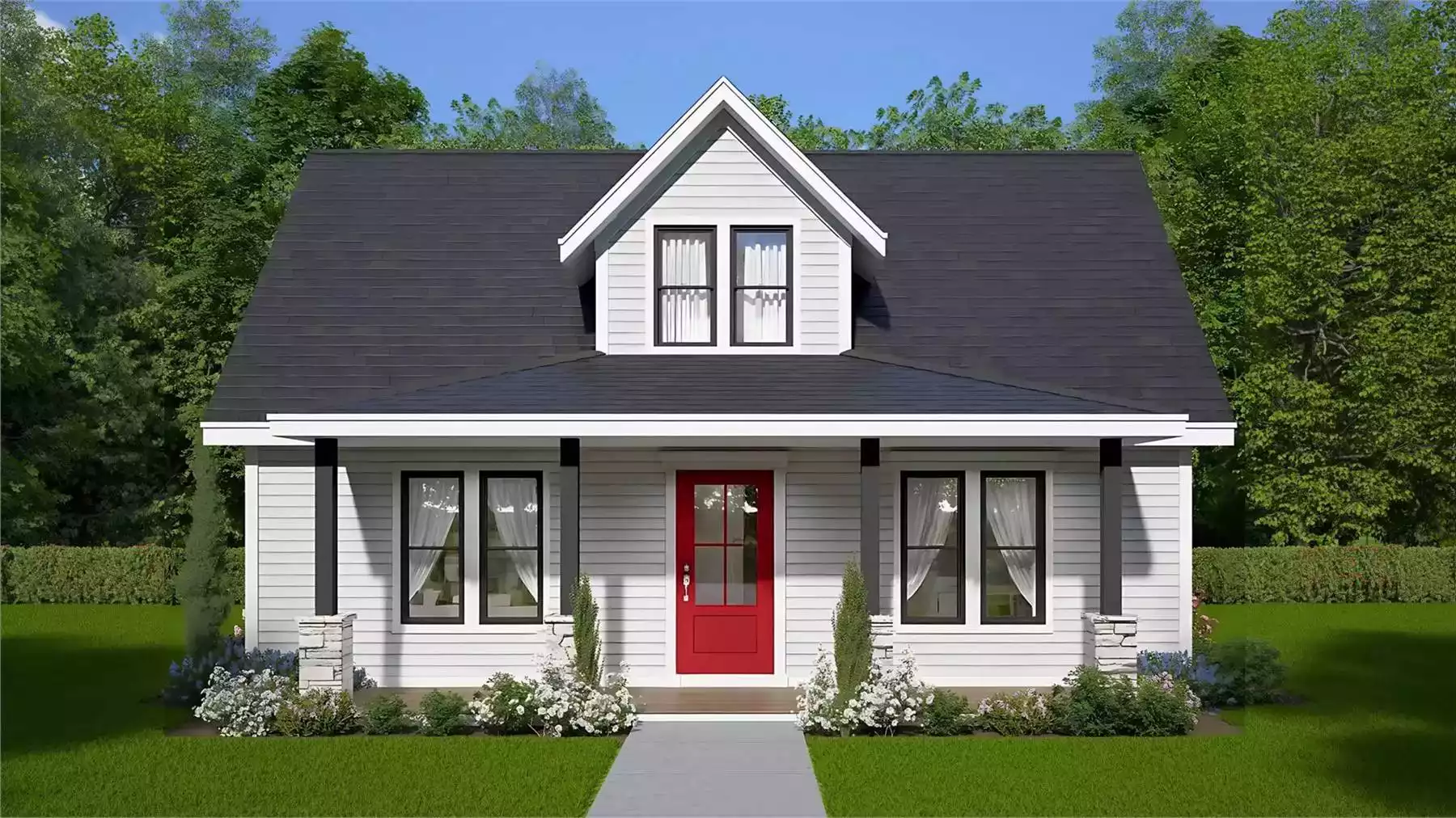 Pairing cute cottage aesthetics with an affordable design and energy-efficient construction, House Plan 11117 would make a wonderful home for a small family as well as a comfortable guest house ADU! This cottage offers 675 square feet with two bedrooms and one bathroom on one level. All the finished space is neatly packaged into a rectangular footprint to keep costs down. There's also a front covered porch and a rear deck that add additional outdoor potential! Inside, an open dormer brings tons of light into the entry area. You'll find an eat-in kitchen with a peninsula bar on one side while the living area is on the other. The back hallway places the bedrooms on opposite sides, with the bathroom and laundry closet centrally located. What a thoughtful little home! If you love this design but would like vaulted ceilings instead of flat, take a look at House Plan 10976