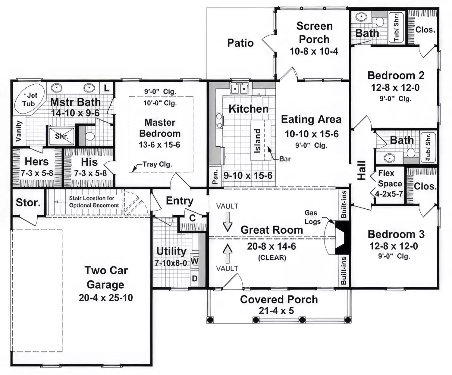 This 1,800 square foot home offers a warm and inviting layout designed for everyday comfort and effortless living. The open floor plan centers around a vaulted great room that flows naturally into an expansive country-style kitchen equipped with both a walk-in pantry and a convenient peninsula. The main-floor primary suite includes double vanities, separate tub and shower, and two walk-in closets, along with a nearby nursery room for added versatility. Split bedrooms create privacy, while the dedicated home office, exercise room, and library/media room provide flexible spaces for work and relaxation. A screened porch and rear porch extend the living area outdoors, offering peaceful spots to unwind. Storage spaces and unfinished areas add practical convenience throughout the home. With its thoughtful layout and inviting spaces, this design creates a welcoming retreat for comfortable family living.