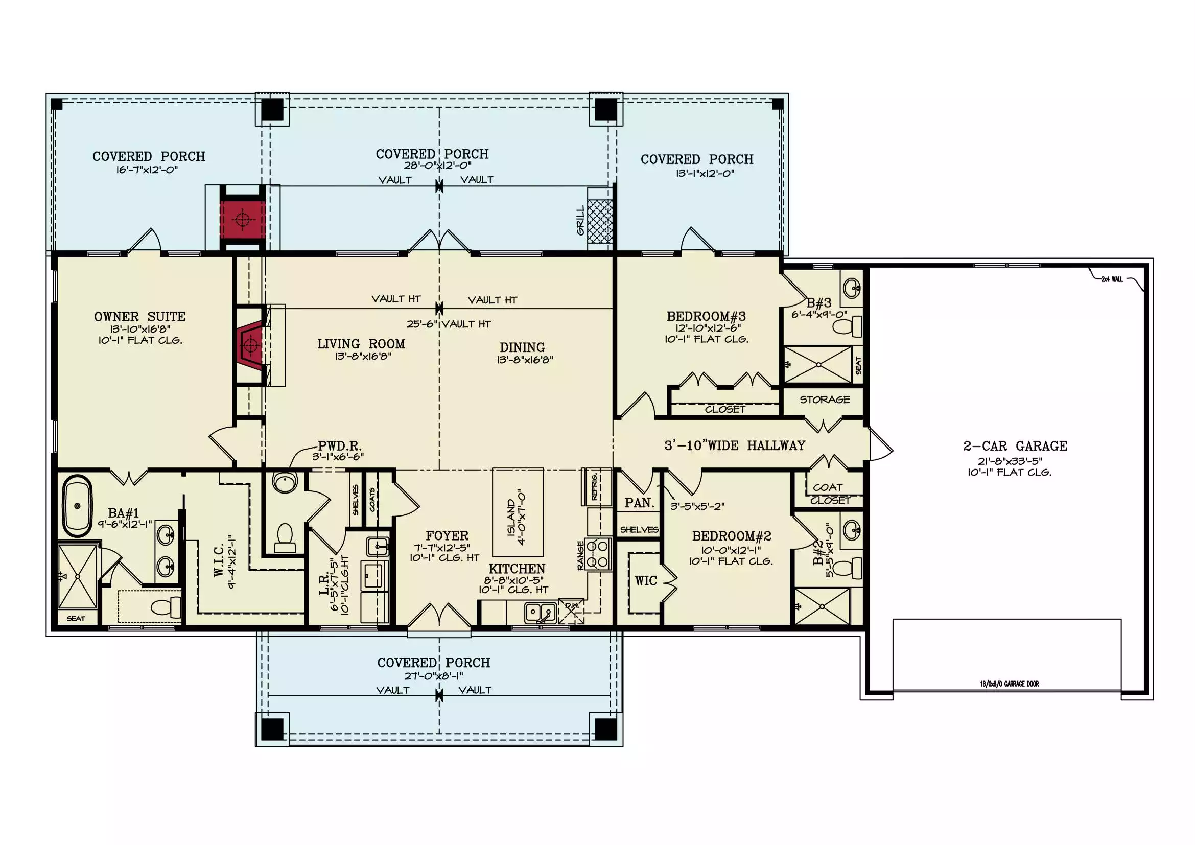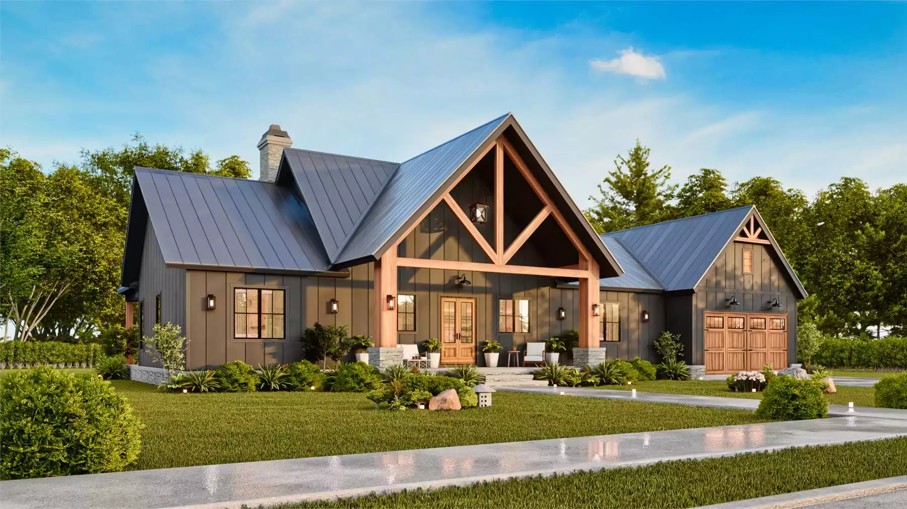 Here by popular demand! House Plan 2386 is the two-car attached garage version of House Plan 7623, a rustic ranch made for a natural location! This design boasts 1,928 square feet across a wide layout without as much depth, so it's poised to take in sweeping views. Inside, a vaulted great room makes up the center of the floor plan, with an L-shaped island kitchen beside the front entry and a dramatic vaulted ceiling with large and high windows over the living and dining areas. On one side, you'll find the luxurious primary suite with a five-piece bath and a large walk-in closet. The laundry and powder room are also on this side of the house while the other two bedroom suites sit opposite one another in the hallway that attaches to the garage. But that's not all! There's a nearly full-width back porch with vaulted and flat ceilings as well as an outdoor fireplace. Just imagine enjoying this home year-round or in your favorite location spot!