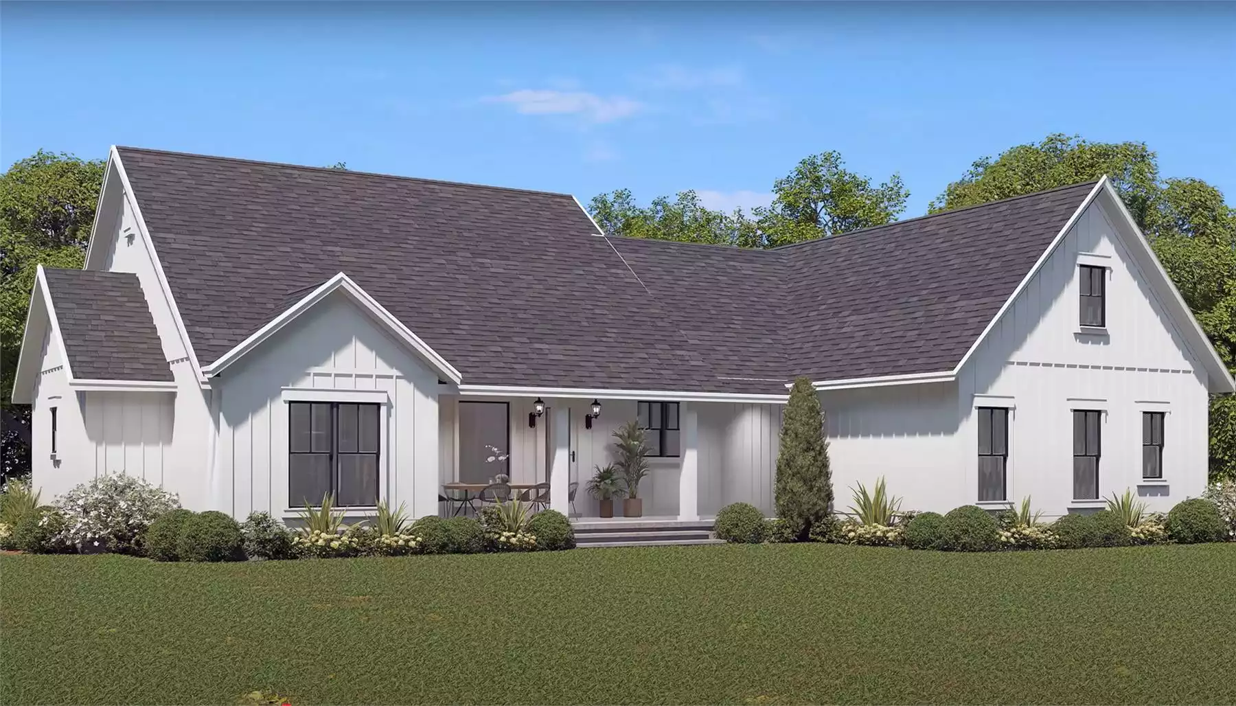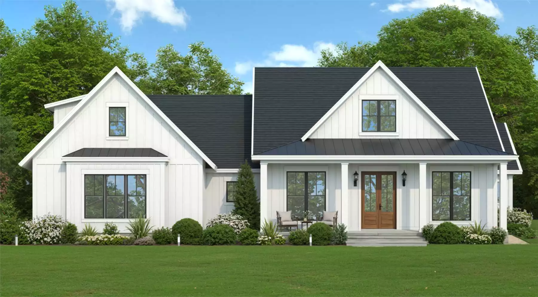 Walden, Plan 8516, an exclusive design found only on our site that has been built by happy customers all around the country as you can see for yourself in Chelci and Brian's New Home Tour video! With 2,188 square feet that includes three bedrooms and two-and-a-half baths in a one-story layout, families are drawn to this country-style farmhouse for its perfectly balanced interior. Step inside and the dining room next to the foyer has a trayed ceiling for definition, but still opens to the great room and kitchen. The living area sits beneath a cathedral vaulted ceiling with decorative beams and a floor to ceiling fireplace. The U-shaped island kitchen can be found through a wide entry highlighted by brick accent walls that can be customized to your liking. It has thoughtfully spaced appliances and a large walk-in pantry that offers lots of storage space. The hallway behind the kitchen contains the entry from the garage, the powder room, the laundry room, and the luxurious primary suite. The vaulted primary bedroom has plenty of charm on its own, and the five-piece bath behind a barn door adds even more with dual vanities, a freestanding tub with a view, a spacious shower stall, and a private toilet closet. Don't miss the walk-in closet with direct laundry room access, either! The other two bedrooms are on the opposite side of the house to maximize privacy, one with front views and the other with rear. They each have their own walk-in closets and share a divided four-piece hall bath between them. If you need more, this nifty design has a bonus room over the garage with a closet and a full bath which is perfect for an additional bedroom, office, playroom, or whatever else you may need!