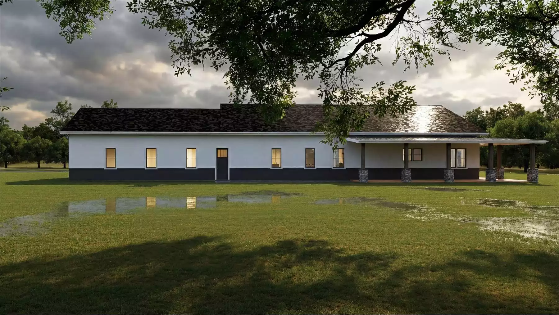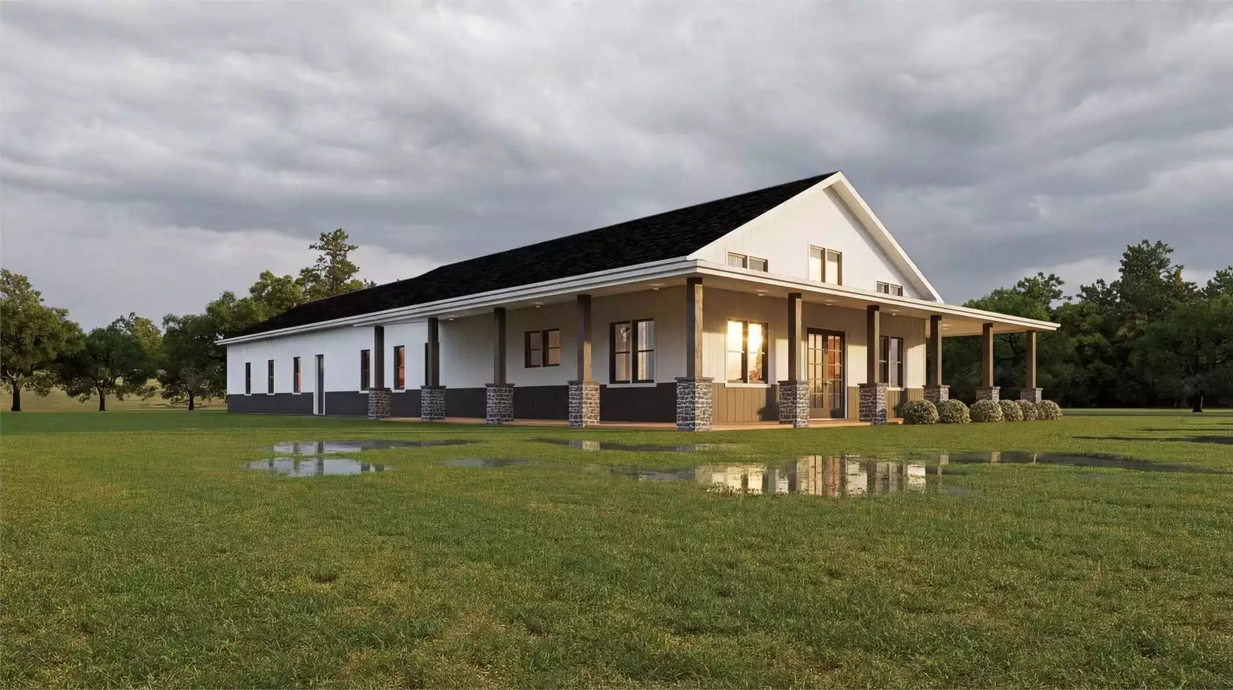 This 2322 square feet, 1 story home plan offers 4 bedrooms and 3 baths in a spacious open floor plan designed for comfortable family living. A vaulted great room creates an airy focal point, flowing seamlessly into the dining area and L-shaped kitchen. The kitchen features a large island, peninsula with eating bar, and a convenient butlers pantry to maximize storage and entertaining efficiency. The primary bedroom is located on the main floor and includes a walk-in closet and double vanity sink for added comfort. Three additional bedrooms provide flexible space for family or guests. A dedicated home office, mud room, and first-floor laundry enhance everyday functionality. Covered front and rear porches, along with an expansive wraparound porch and outdoor living space, extend the home outdoors. The attached side-positioned, front-entry 3 car garage offers generous storage and practical access.