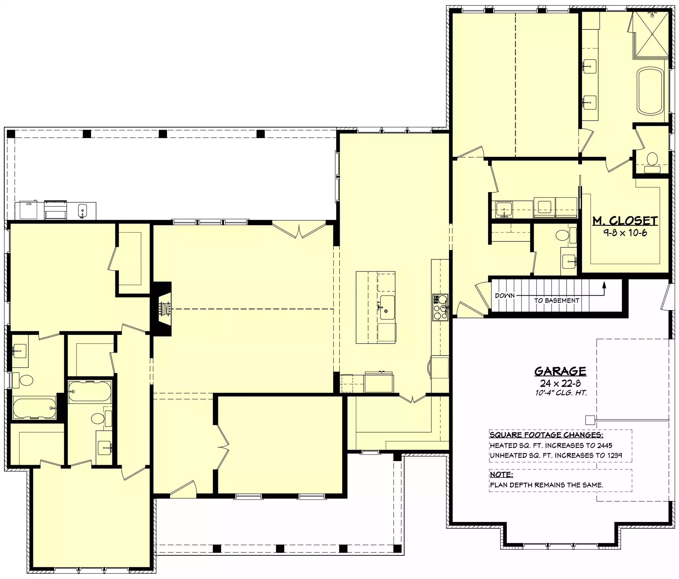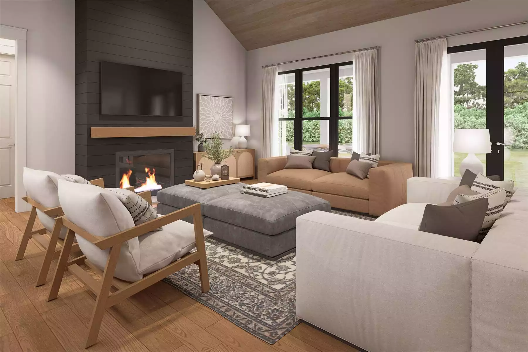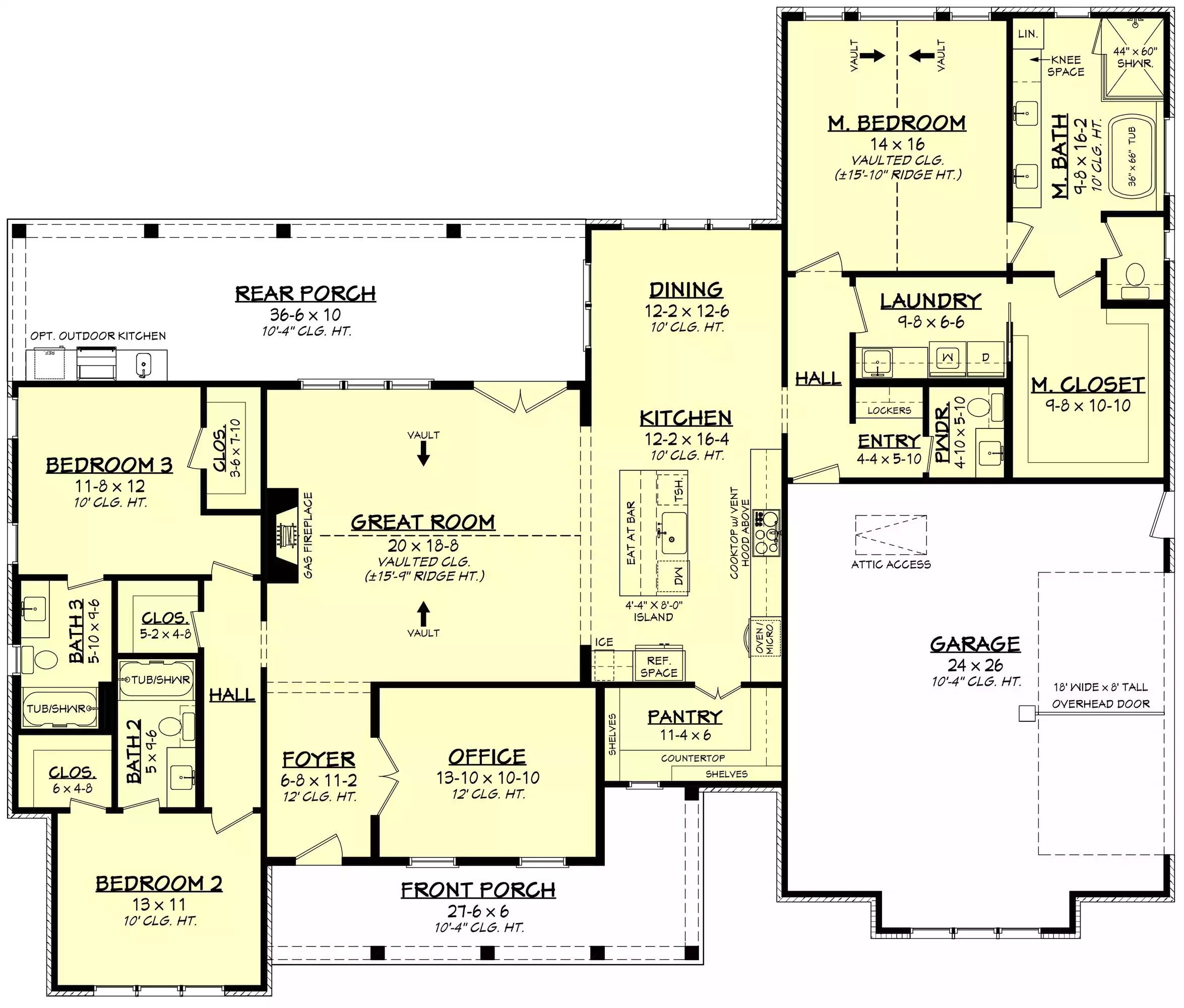 This 2,427 square foot home offers 3 bedrooms and 3.5 bathrooms in a single story layout with vaulted spaces and strong indoor outdoor connection. The great room features soaring vaulted ceilings, a fireplace, and open flow that creates a bright central gathering area. A country kitchen with island seating, peninsula bar, butler’s pantry, and L-shaped workspace supports daily use and entertaining. A foyer and home office add flexibility near the front of the home, while a mud room and first floor laundry improve everyday function. The main floor primary suite includes vaulted ceilings, a walk-in closet, double vanity sinks, and a separate tub and shower. Split secondary bedrooms provide privacy while keeping the layout efficient. Covered front and rear porches, outdoor living space, and an outdoor kitchen extend the home for entertaining and relaxation. An attached side entry 2 car garage completes the design with practical storage and convenience.