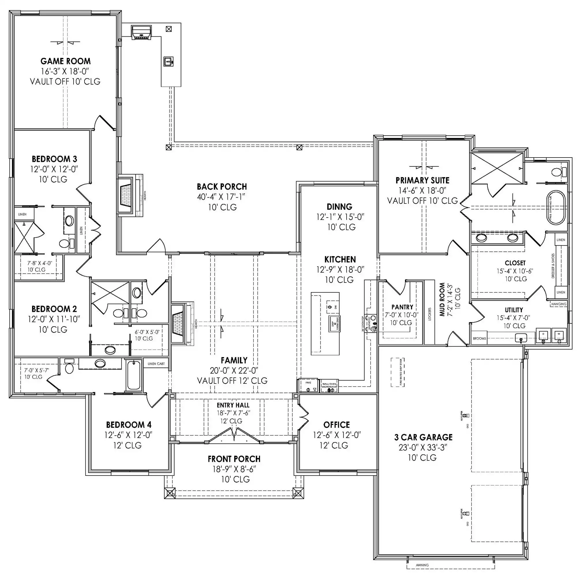 Looking for a luxury home with rustic country charm? Stop and explore House Plan 9180, a 3,563-square-foot ranch with plenty of exterior stone and beamed ceilings to enjoy inside! This design places an office by the foyer while the open-concept living area fills out the center of the floor plan, complete with an island kitchen and vaulted living with a fireplace. This connects beautifully with the back porch, where you'll find an outdoor fireplace and a BBQ kitchen to really expand the livability of the house. The vaulted five-piece primary suite is located on one side of the great room while three other suites are across the house, with one in front and two in the back hallway along with the game room. With a home like this, the whole family can live and host in style!