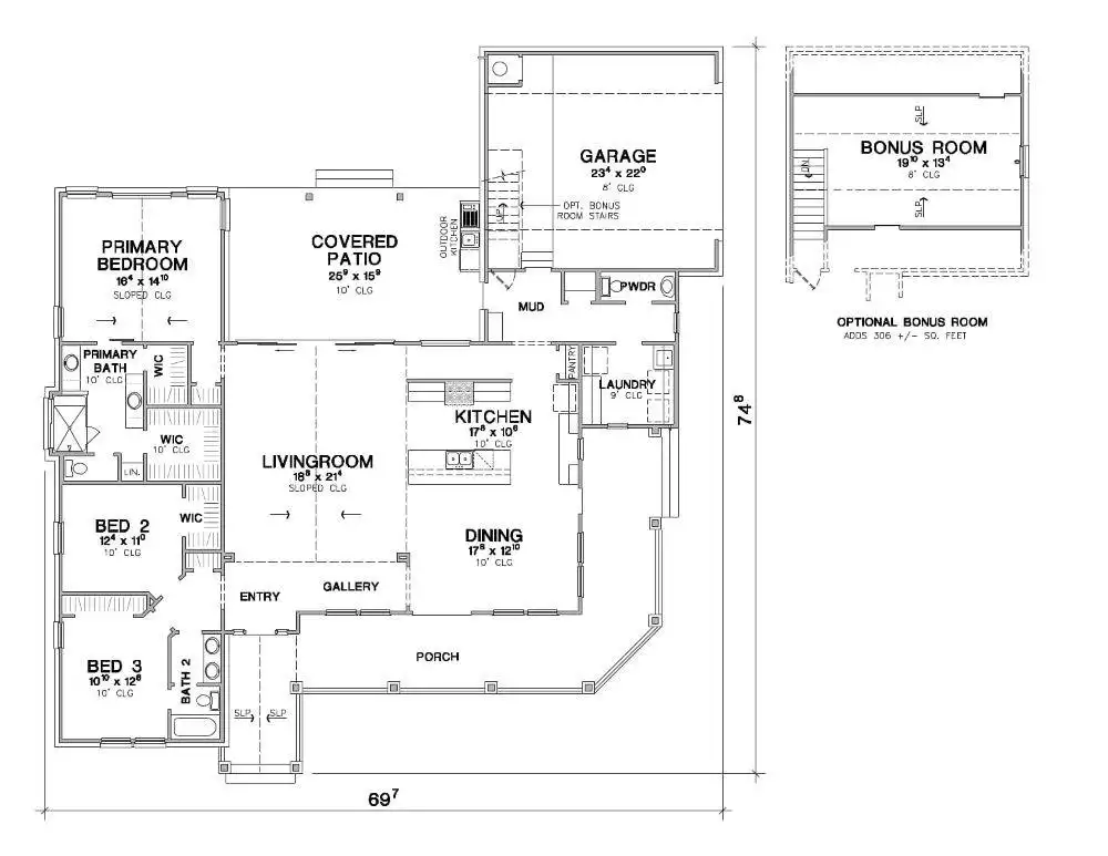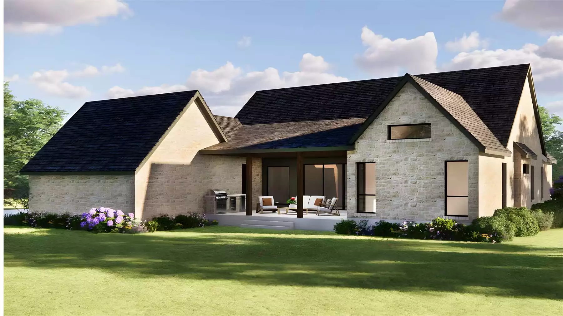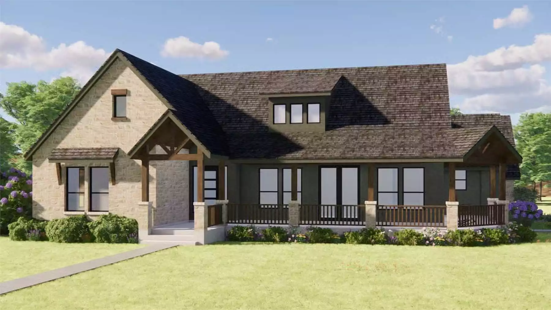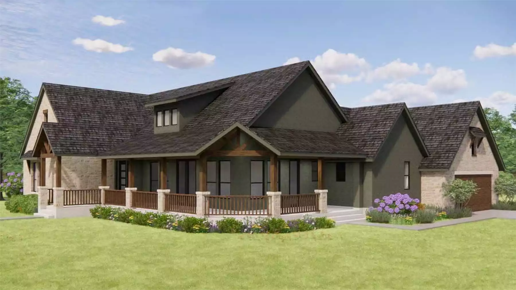 Building out in the country? House Plan 11079 could be the perfect ranch for you with its rustic style inside and out! Offering 2,246 square feet with three bedrooms and two-and-a-half bathrooms, it's also a wonderful fit for a family. Step on up and a wraparound front porch beckons you to enjoy some time in the fresh air. Inside, the entry connects to the common spaces as well as the front hallway with two bedrooms and a hall bath. The living area boasts a vaulted ceiling overhead and connects to the back patio with an outdoor kitchen through four-panel sliding doors. The primary suite is placed on the side, behind the other bedrooms, and has a vaulted ceiling in the bedroom, a four-piece bath with a stall shower, and his and her walk-in closets. The island kitchen and dining area are open to each other on the opposite side of the living space. In the back hallway, you'll find the mudroom that connects to the laundry room, the powder room, and the two-car garage. If you're looking for more, you can finish the bonus room over the garage for another 306 square feet!