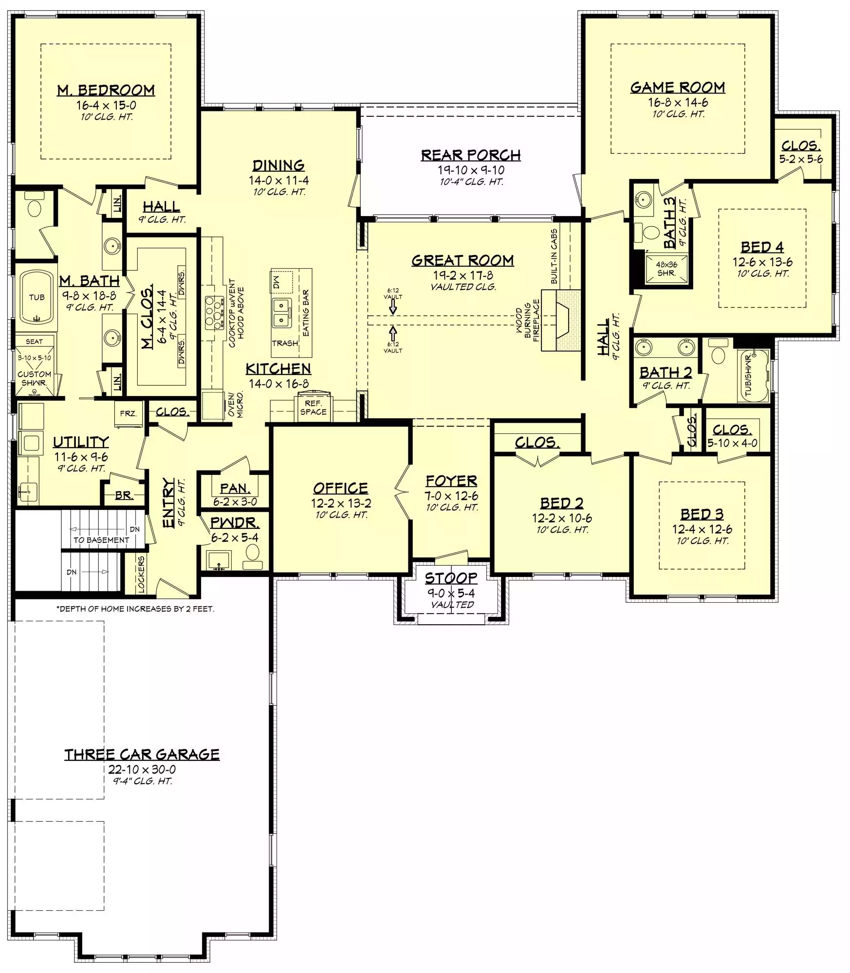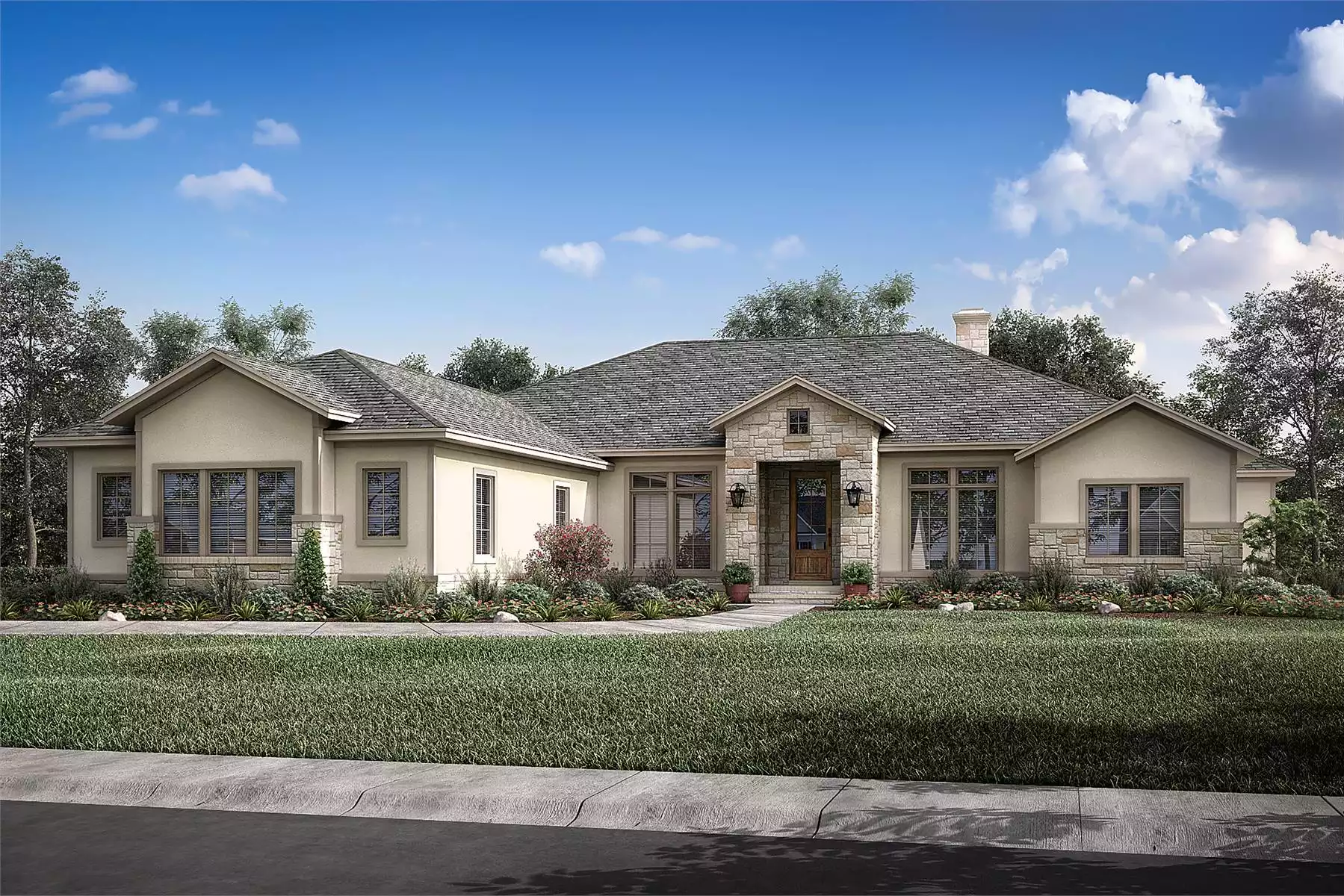 House Plan 11499 is a rustic country ranch that'll fit right into Texas and elsewhere in the sunny Southwest! It offers an ample floor plan with 3,044 square feet, four bedrooms, three-and-a-half bathrooms, and a three-car garage in front with side entry. The office is conveniently placed off the foyer while the great room spreads out in back, with a cathedral vaulted ceiling over the living area with a wood-burning fireplace. The island kitchen sits adjacent, beside the casual dining nook. The hallway off the kitchen is where you'll find the walk-in pantry, powder room, laundry room, and the mudroom that connects to the garage. The primary suite is placed off the dining area and has a tray ceiling in the bedroom, a five-piece bathroom, a large walk-in closet, and direct connection to the laundry room. Across the house, the other hallway includes two bedrooms that share a divided hall bath and another bedroom that shares a full bathroom with the game room. It's a perfectly flexible layout that can transition as your needs do!