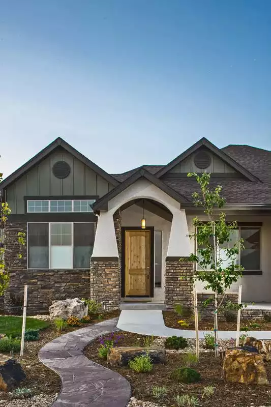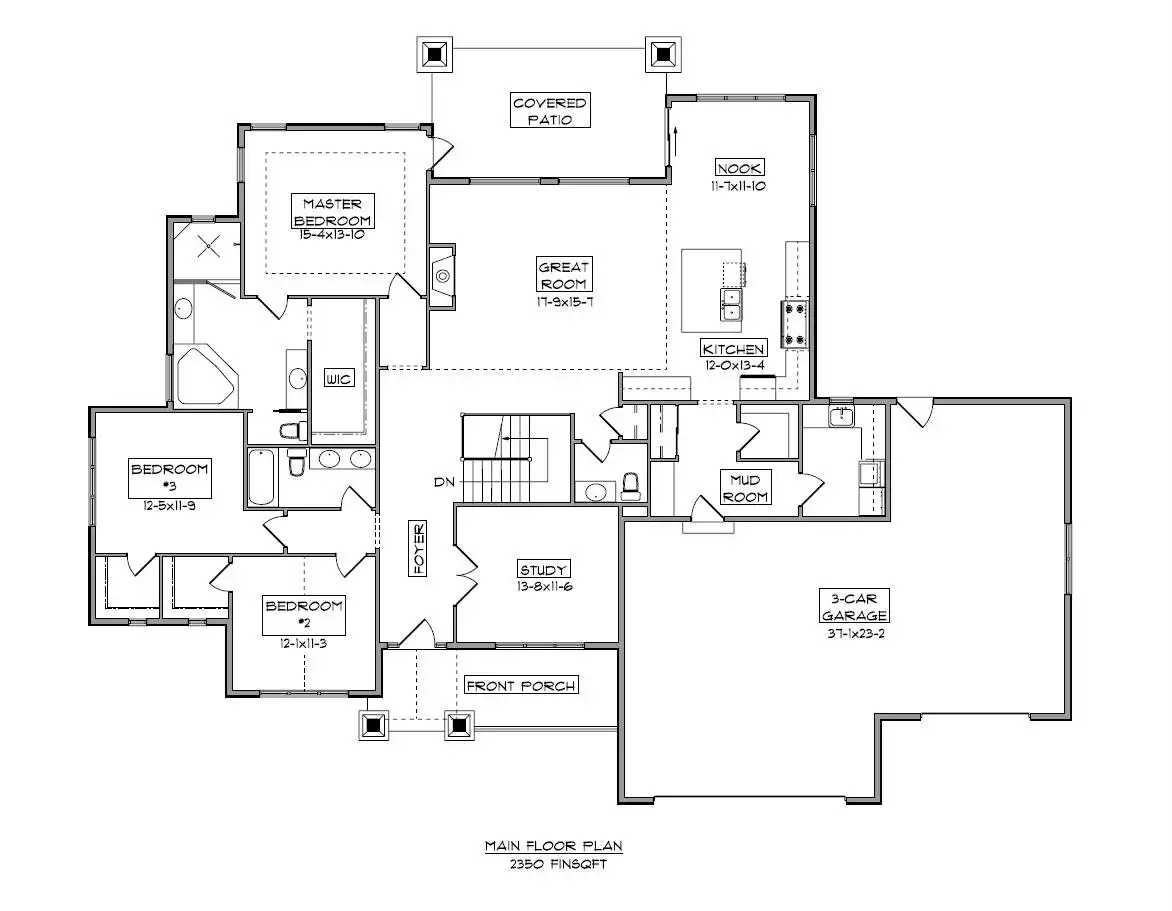 This welcoming Craftsman Ranch design offers 2,350 square feet of thoughtfully planned living space with 3 to 5 bedrooms and 2.5 to 3.5 baths. The exterior combines stucco, stone, and tapered columns for timeless curb appeal. Inside, French doors open to a quiet study while the great room, kitchen, and breakfast nook flow seamlessly for easy family living. The primary suite enjoys access to the rear covered patio and includes a spacious bath with a private commode and walk-in closet. Two secondary bedrooms share a full bath, making this layout ideal for families. Everyday convenience is built in with a mudroom, laundry room, and 3-car garage entry. The optional lower level expands the home with a rec room, wet bar, and two more bedrooms with a full bath. With its mix of style, comfort, and flexibility, this plan is both inviting and practical.