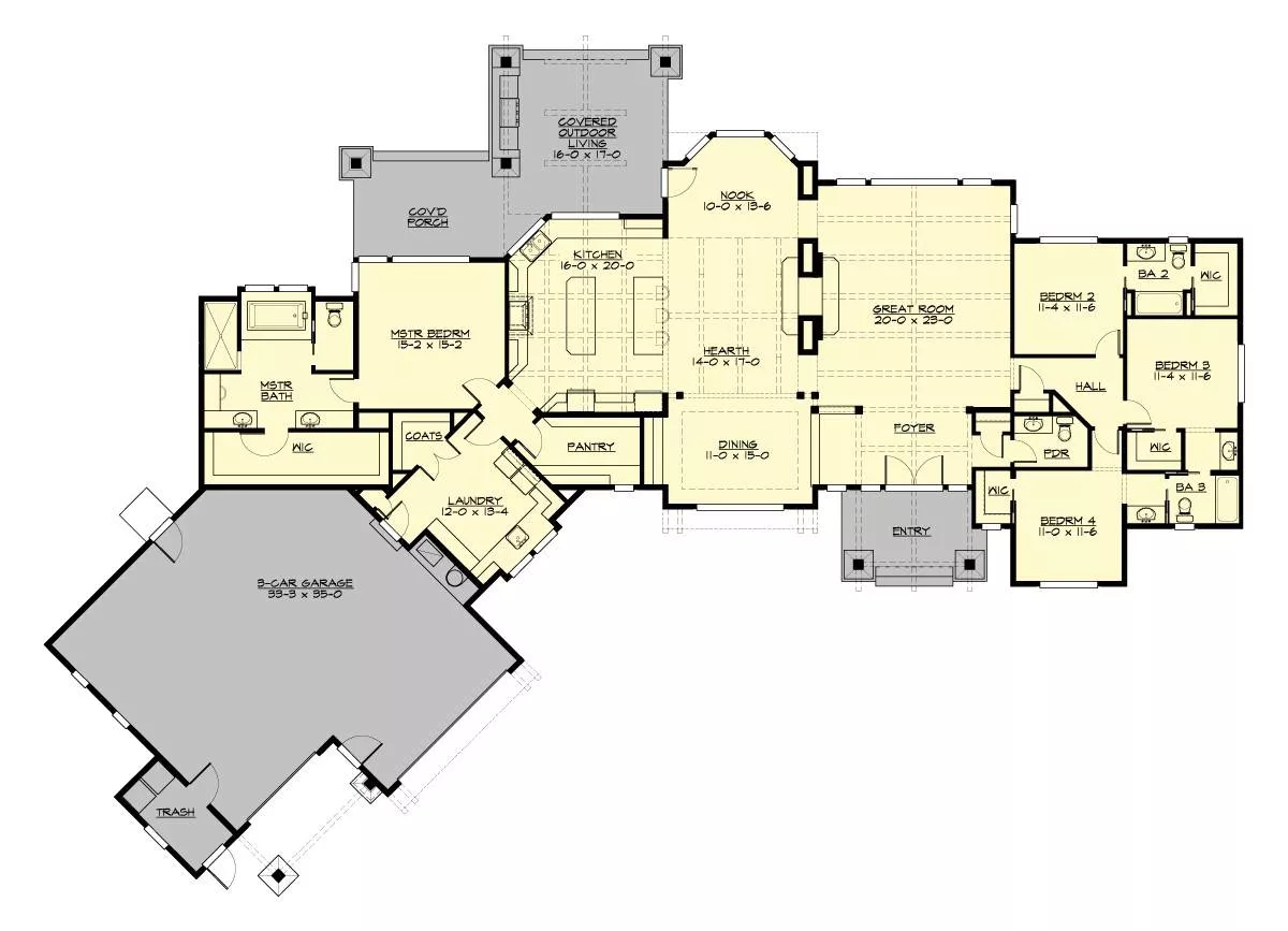 Everything about House Plan 7466, a sprawling Craftsman estate, is centered around comfort and ease of living. This 3,270 square foot ranch-style plan is accessible and spacious thanks to its single-level layout. An attached 3-car garage joins with the sharp yet rustic details of the façade, such as the gabled roofline with exposed wood and stone elements, to create a stately yet welcoming feeling. As you step inside and into the foyer, you are immediately greeted with an amazing layout that places the common spaces between the bedrooms. The expansive great room sits directly ahead, featuring a brilliant double-sided fireplace that it shares with the hearth room, as well as providing access to the three auxiliary bedrooms. Two of these bedrooms share a Jack-and-Jill style bath, and the other has its own private ensuite and walk-in closet, making it a perfect place for guests. Continue across the house and you'll find an exceptional U-shaped kitchen with two islands overlooking the hearth room, which is open to the dining room and breakfast nook on either side. A spacious walk-in pantry provides ample storage for food, while the breakfast nook leads out on to a great covered back porch complete with a built-in barbecue! The garage enters the home into the mudroom and laundry room, in a convenient location by the pantry. Finally, no home would be complete without a great primary suite, and this plan provides just that. Relax in the large bedroom and soothing spa bath. You'll want for nothing with this five-piece ensuite and large walk-in closet!