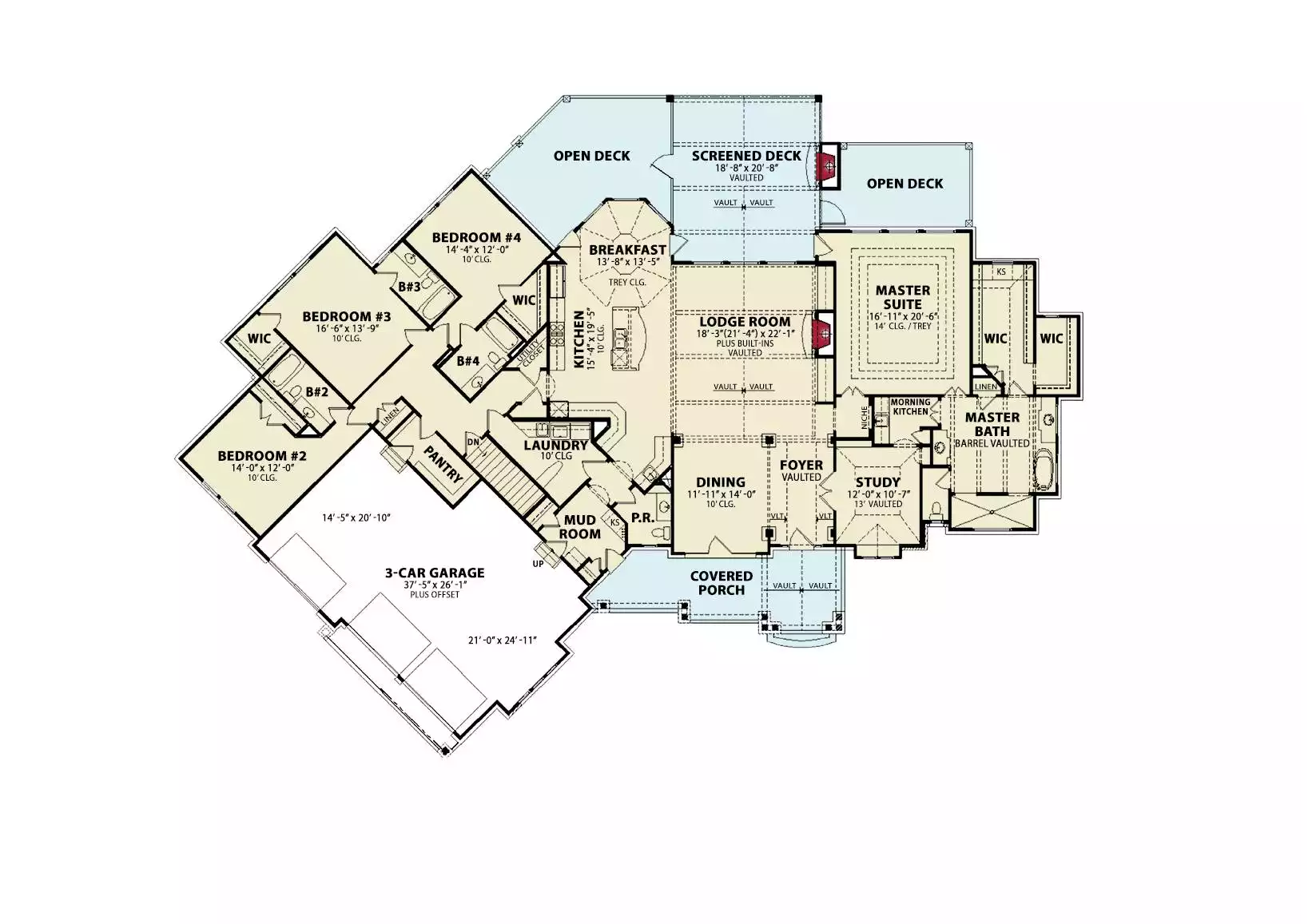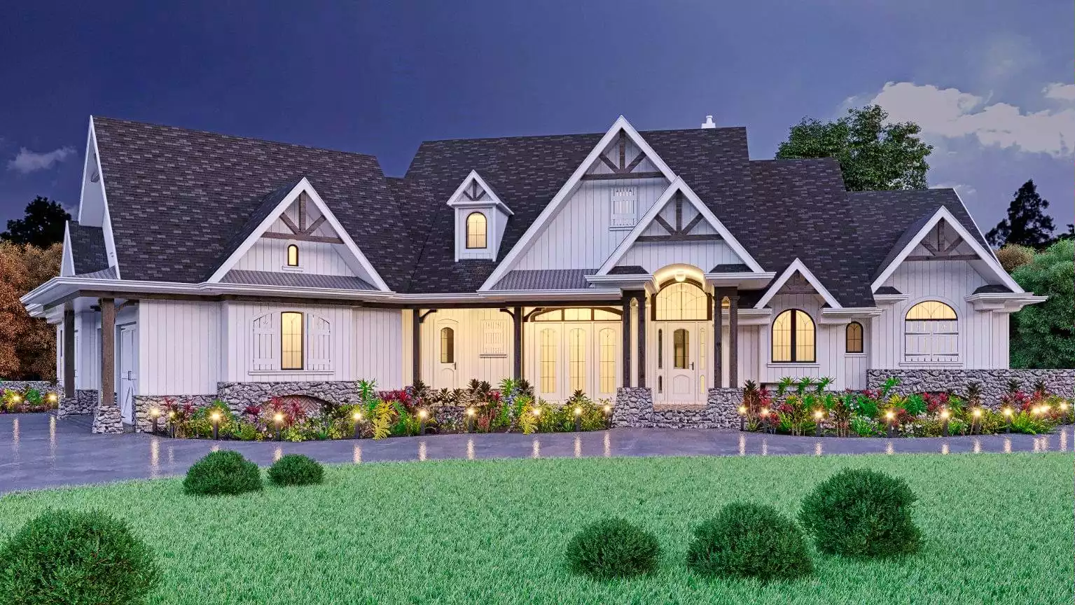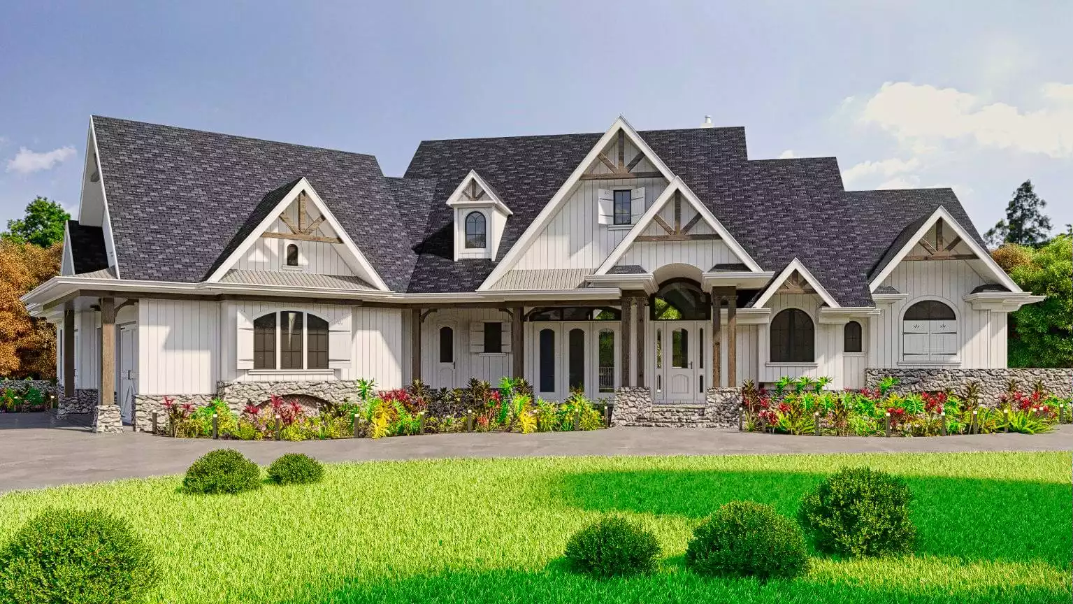 The Chamomile is a stunning one-level Craftsman house plan featuring multiple gables, decorative timber brackets, and timber accents on the porch and three-car garage for exceptional curb appeal. Inside, a vaulted foyer opens to a dining room and a study with French doors. The lodge room boasts a vaulted ceiling, a built-in fireplace, and a wall of windows with views of the rear. The kitchen overlooks both the breakfast and lodge rooms and includes a spacious walk-in pantry. A mudroom off the garage leads to a laundry room accessible from both the kids' bedrooms and the master suite, which offers a tray ceiling, patio access, and a luxurious bath with a large walk-in closet, shower, and morning kitchen. Three additional bedrooms with private baths are located across the home. The back includes three connected outdoor spaces for entertaining and scenic enjoyment, while the lower level provides potential for three more bedrooms, recreation space, storage, and outdoor access.