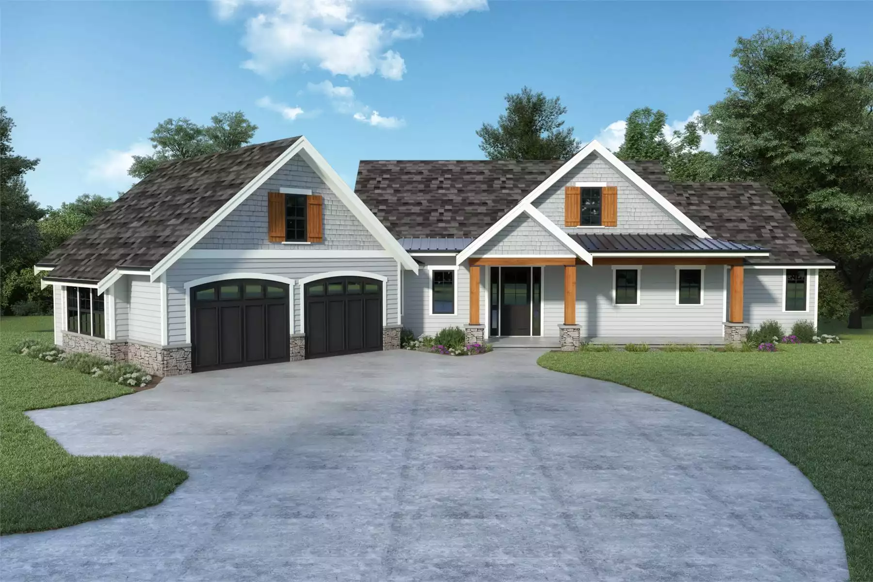 A welcoming front porch and an angled garage beckon you and your guests into this lovely home. Packed full of traditional farmhouse styles with pops of modern and Craftsman flair throughout, the 3,248 square foot layout is brimming with amazing features. And the 2-story layout is perfect for a recessed or sloping lot thanks to its fully finished basement addition. The main level houses the majority of the 3 bed 2.5 bath floor plan. Here you'll find open and inviting spaces such as the grand family room and the island kitchen, both of which are flooded with warm natural light thanks to the large windows on virtually every wall. The first floor also houses the master suite and its resort-style spa bath along with a huge walk-in closet. There is also a mud room and the laundry room, as well as a massive back deck to complete the journey throughout the ground floor. Then, it's time to move to the basement. There you'll find a huge bonus room, full of storage options and endless customization potential. 2 more bedrooms and a large storage room round out the offerings before a walkout patio leads you outdoors to enjoy all that nature has to offer.