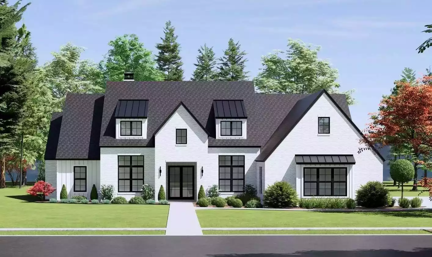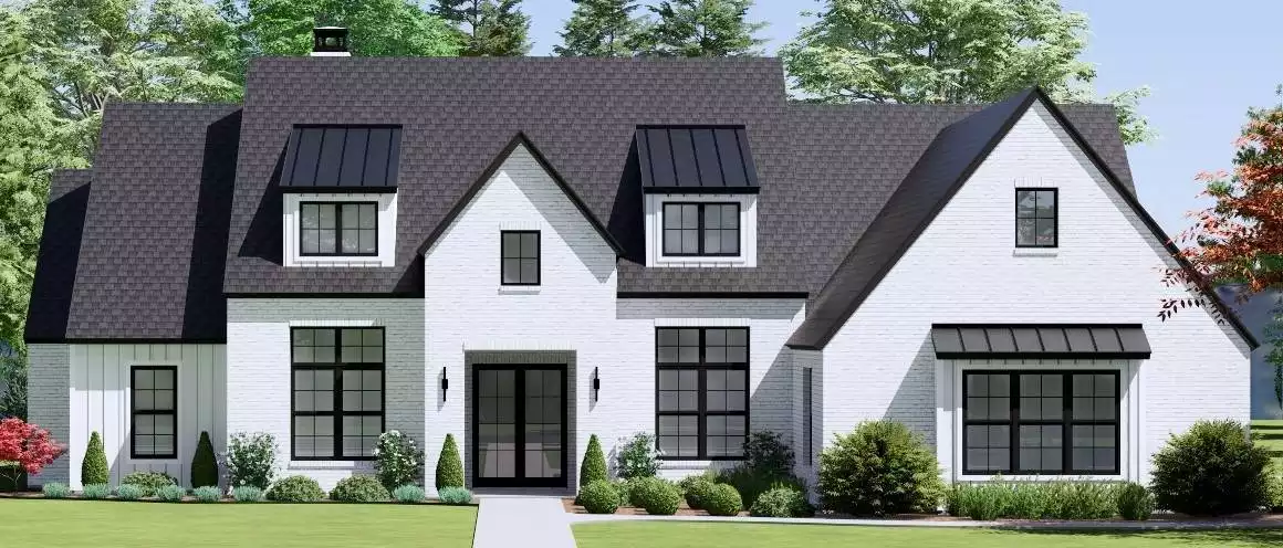Check out House Plan 9174 if you're in the market for a stylish ranch with plenty of room for the whole family! This design boasts 3,145 square feet in a great layout for today's tastes. First up, there's an office/flex room off the barrel-vaulted foyer. The hallway to the side includes three bedroom suites for the kids and/or guests. The family room has a beautiful beamed ceiling above, a natural focal point in the fireplace, and built-ins. It sits beside the kitchen for an open-concept feel. Make sure to notice the two islands in the kitchen, the sunny dining to the side, and the vaulted ceiling that spans this area all the way out to the covered outdoor living. The primary suite is privately tucked behind this and boasts a five-piece bath and a walk-in closet that connects to the laundry room and mudroom on the other side. Finally, the side-entry garage in front parks three!