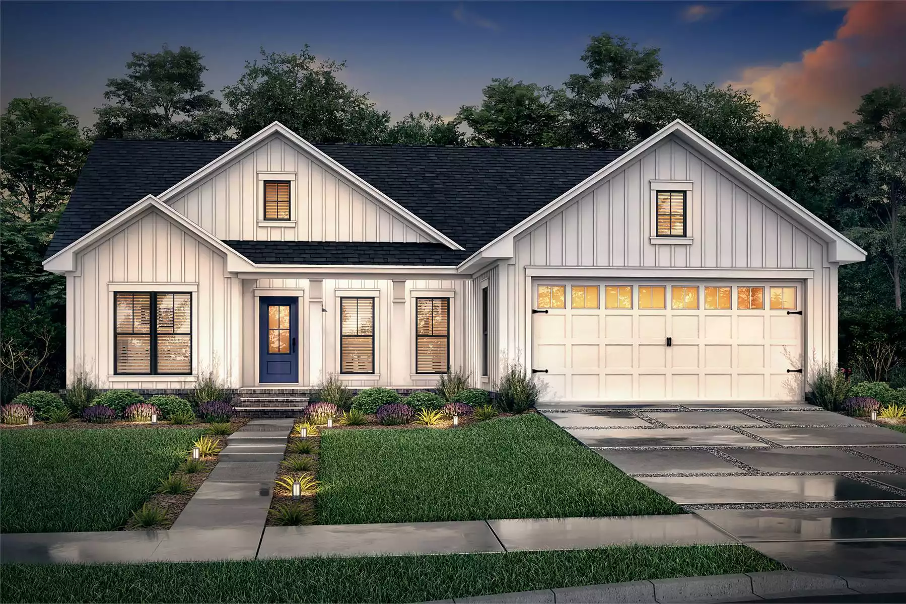 House Plan 6739 has everything today's families need in a chic and simple ranch format! Behind that country exterior, you'll find 1,416 square feet with three bedrooms and two bathrooms. Enter through the front door and you'll immediately be welcomed into the open great room, with clear views back to the island kitchen and dining area. The master suite is placed in the hallway with the laundry room and mudroom coming in from the garage. The other two bedrooms sit in the opposite hallway, separated by a hall bath. If you're looking for a neat, budget-friendly home with split bedrooms on one level, this would make a great choice!