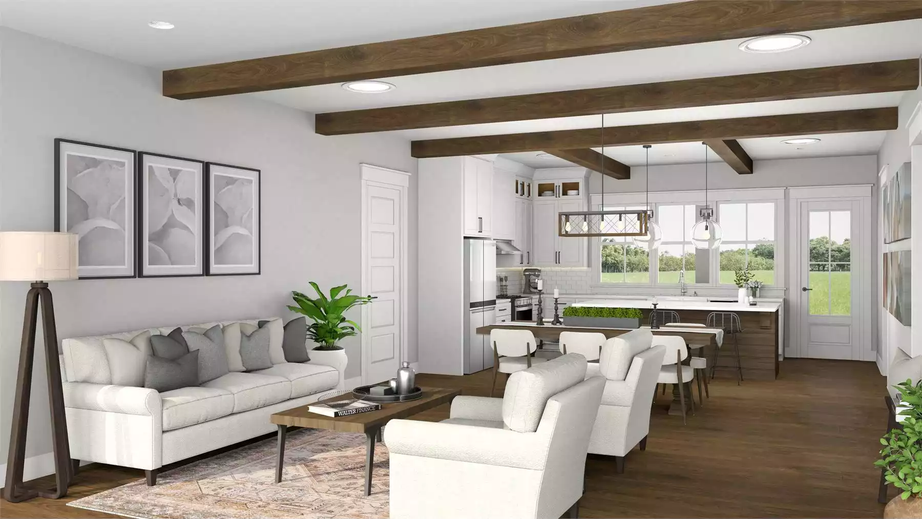 If you're looking for an affordable one-story cottage, House Plan 6895 is here for your consideration! This 1,479-square-foot design based on House Plan 4367 offers a completely open-concept great room that enters into the living space and is anchored by the island kitchen in back. The whole room sits beneath a beamed ceiling. Two bedrooms and a hall bath are located in the front hallway while the master suite is in back with the laundry room. All this comes wrapped up in a cute country exterior that will fit beautifully into suburban and rural locales!