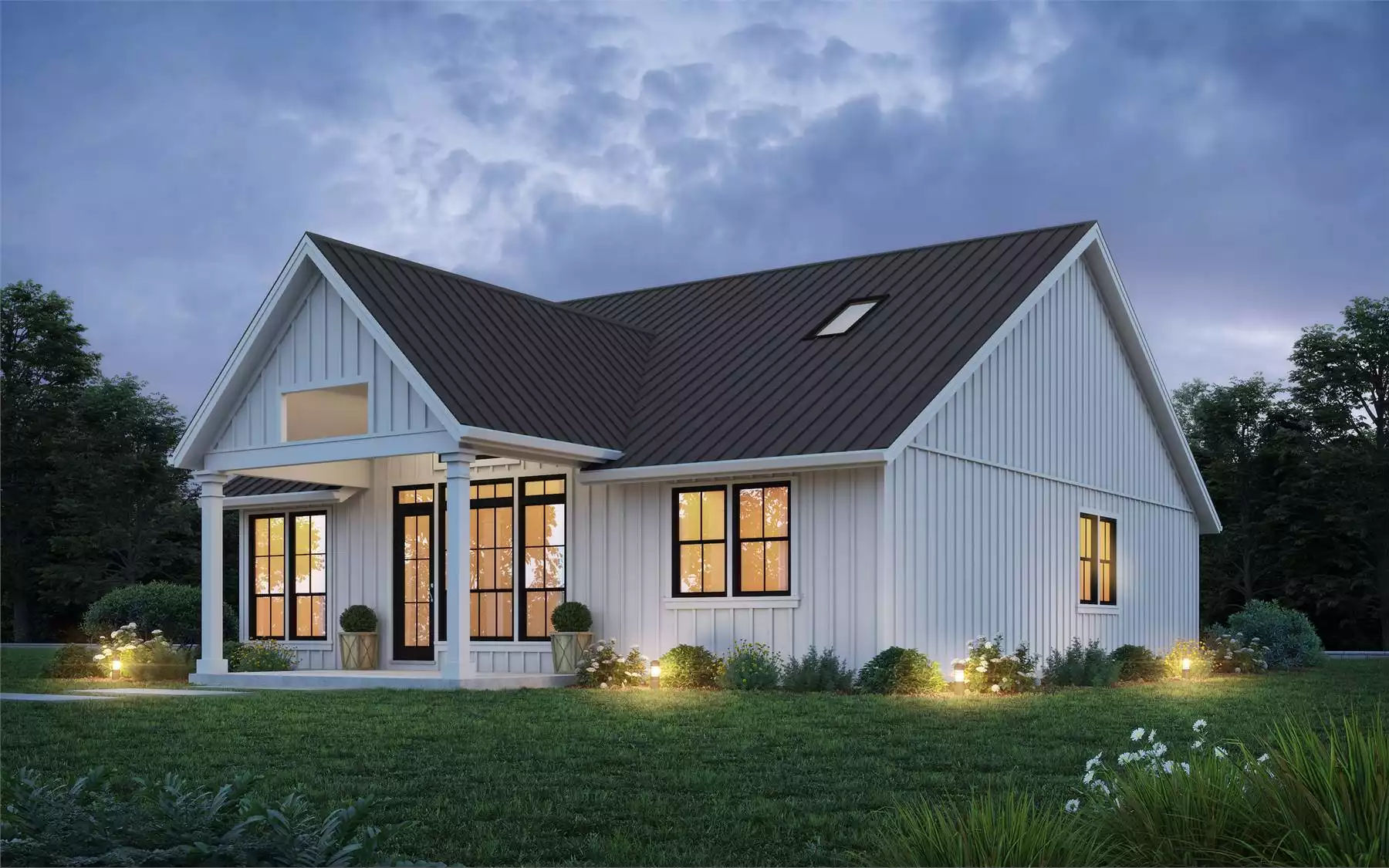 This country cottage house plan stands out with its board and batten siding, twin gables, and functional dormer, offering a striking curb appeal. Spanning 1,487 square feet, it includes 3 bedrooms and 2 baths. The 65 square foot front porch leads to a cozy entry with a coat closet, while the 482 square foot 2-car garage provides entry into the home. The open-concept layout is perfect for gatherings, featuring a kitchen with a large island, a dining area with access to a vaulted outdoor living room, and a living room with a vaulted ceiling and three rear windows. The primary suite offers a dual vanity in the bathroom and walk-in closet, while two additional bedrooms and a shared hall bath are conveniently located near the laundry room.