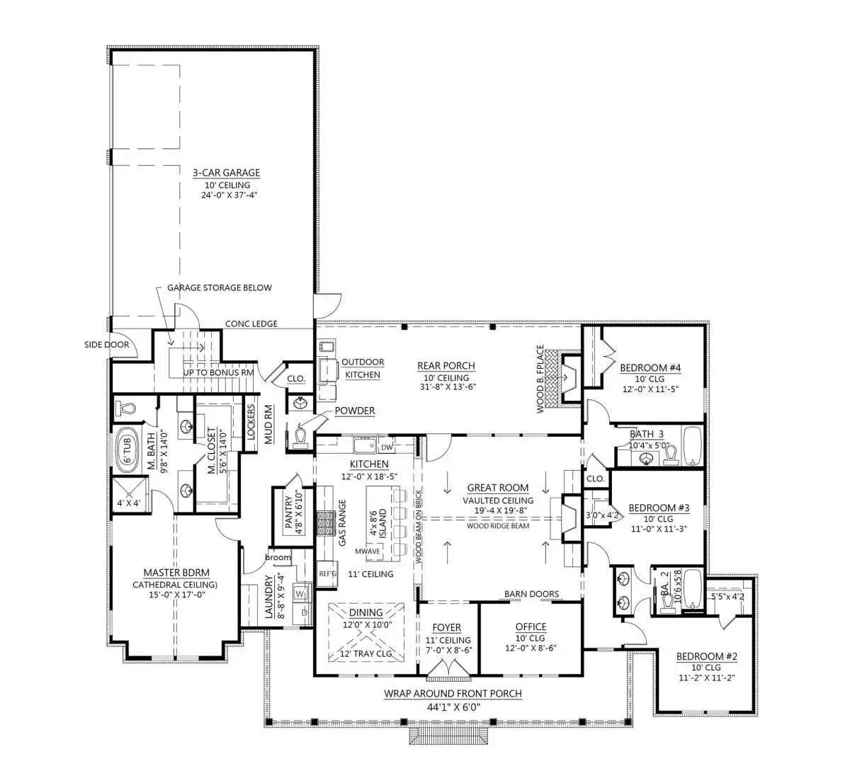 Southern charm overflows from this beautifully inviting country farmhouse. A ranch-style layout makes for a totally accessible and open 2,400 square feet of living space, while 4 bedrooms are perfect for a new or growing family. A sister plan, THD-1062, is slightly bigger at 2,841 square feet and includes a 3D tour, so you can get a feel for this layout! Our Black Creek farmhouse plan's best feature is its open concept design that joins a vaulted great room with an impressive kitchen with center island and walk-in pantry, and formal dining area. Notice how every bedroom has a walk-in closet, including the master which also offers cathedral ceilings and a spacious en-suite bath. The large covered rear porch with 10' ceiling, optional wood burning fireplace and outdoor kitchen is perfect to gather friends and family. Last, a 3-car garage with a separate entry door completes this affordable and beautiful home.