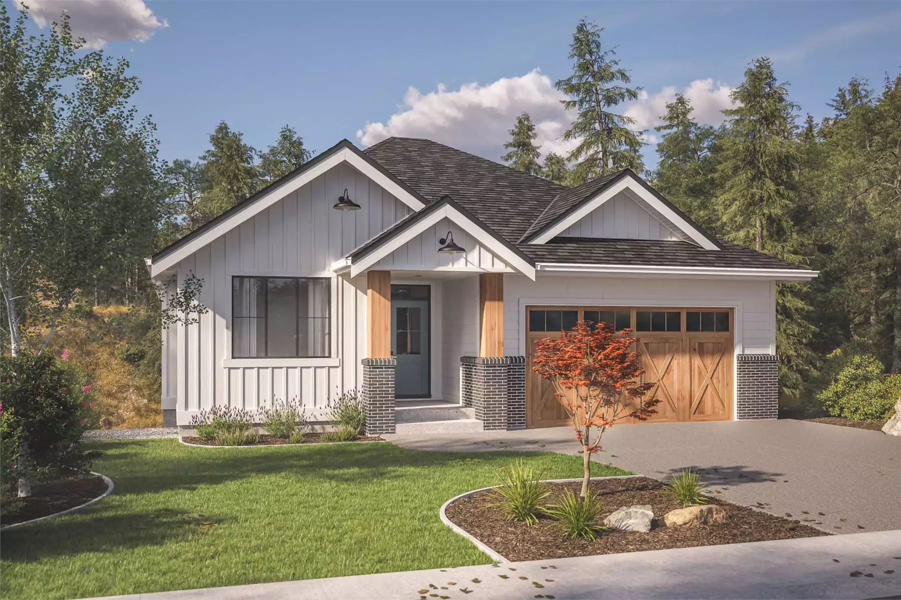 This charming farmhouse plan offers a cozy and functional layout with 2 bedrooms and 2 bathrooms. The main level features a spacious great room, a well-appointed kitchen with a walk-through pantry, and a dedicated dining area. The primary suite boasts a walk-in closet and a private ensuite bath, while the second bedroom is conveniently located near a full bath. Outdoor living spaces include a covered front porch and a sundeck at the rear, perfect for relaxing and entertaining. The design also includes an unfinished basement with the potential for a future bedroom and additional living areas, adding versatility to this home. An attached double garage provides ample storage and parking space.