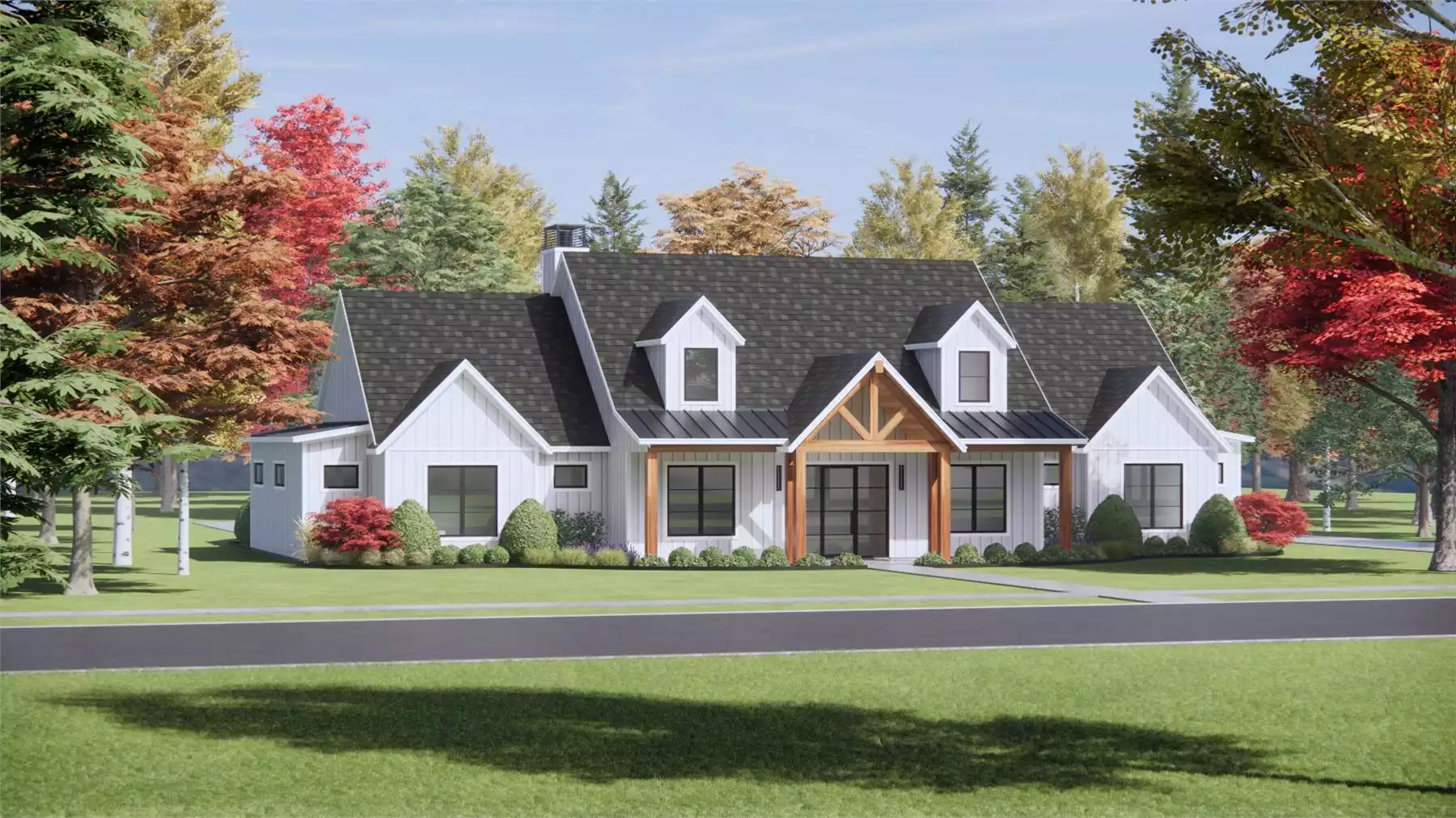 House Plan 7778 may surprise you! This 3,641-square-foot home has traditional farmhouse curb appeal in front and huge modern windows in back to give you the best of both worlds. The layout is also full of vaulted ceilings from the foyer, to the great room, to the primary bedroom. You'll find four bedroom suites split around the house, with the five-piece primary suite in back, one suite in the front hall on the same side of the house, and two suites in the hallway on the opposite side. This arrangement is ideal for parents, guests, and kids! There's also formal dining and an office on the main level and a bonus room over the three-car garage, but that's not all--just imagine what you could do with that huge covered porch in back. This home has it all covered!