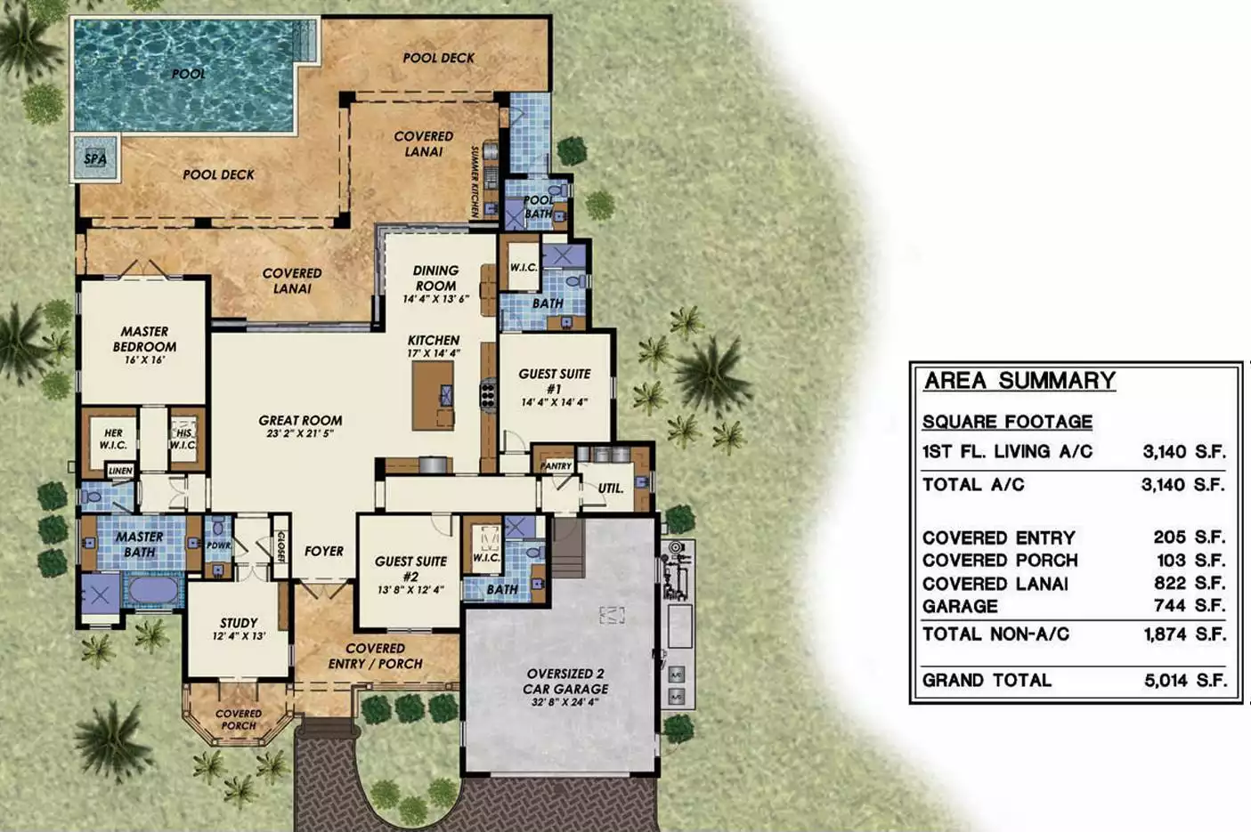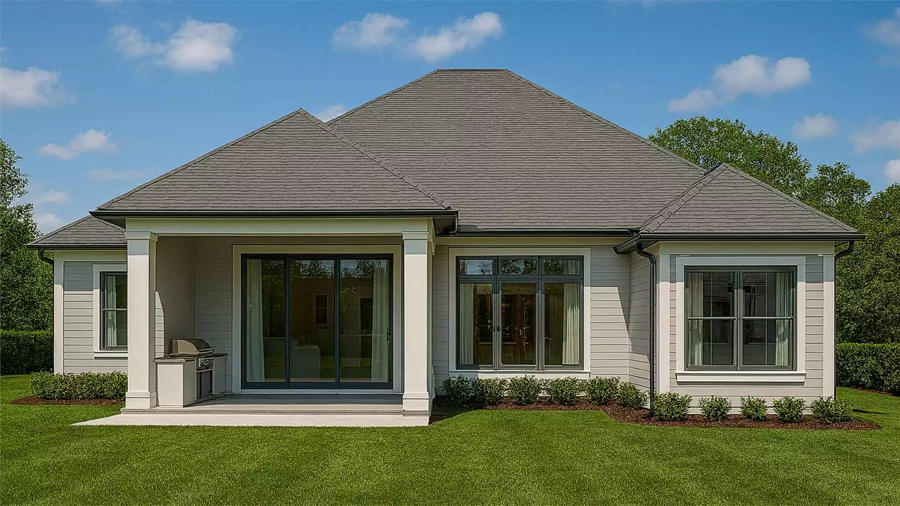 For those looking for stylish living along a sunny coast, take a look at House Plan 10175! This Florida-style ranch offers 3,140 square feet with three bedrooms and four-and-a-half bathrooms perfectly tailored to luxurious year-round or vacation lifestyles. When you step inside, the foyer leads back to the great room, but don't miss the hallway to the right--where you'll find two guest suites, the pantry, the laundry room, and access to the two-car garage. On the left side, there's a short hallway with the powder room and study and another private hallway for the primary suite. Check out that huge five-piece bath and dual walk-in closets! You'll be able to come together with family and host with ease with the totally open layout between the island kitchen and great room. The dining area is tucked off in its own nook with built-ins for seamless sit-down dinner parties, too. And when the weather's good, just look to the back porch with its outdoor kitchen and tons of covered and open space. There's also a full bathroom out here for all your pool needs!