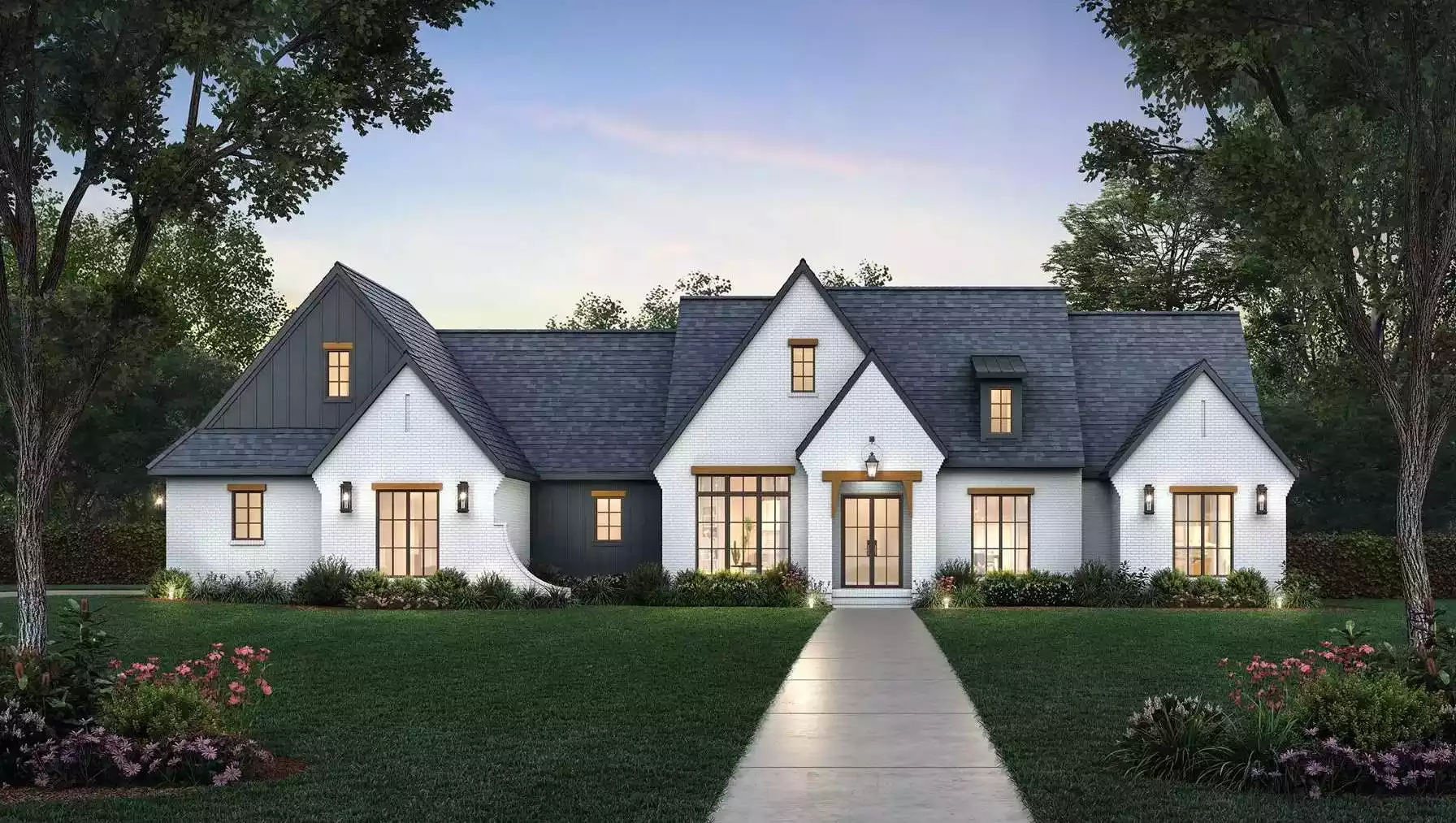 A beautiful ranch with streamlined transitional appeal, House Plan 7505 makes a perfect home for today's families. It offers 2,674 square feet with four split bedrooms and spacious living. A dining room with a trayed ceiling sits beside the foyer while the kitchen is open to the great room when you step inside. Three bedrooms with walk-in closets are tucked into the hallway behind the great room. They share a common four-piece hall bath and have a linen closet nearby as well. The vaulted master suite is privately located in the hallway that stretches back behind the kitchen. It has a luxurious five-piece bathroom and a walk-in closet that connects directly to the laundry room for convenience. Last but not least, a three-car side-entry garage enters into the home through a mudroom with a storage bench, wet bar, and pantry to take in groceries. House Plan 7505 even offers outdoor living with a fireplace and outdoor kitchen in back, so you can expand outside at your leisure!