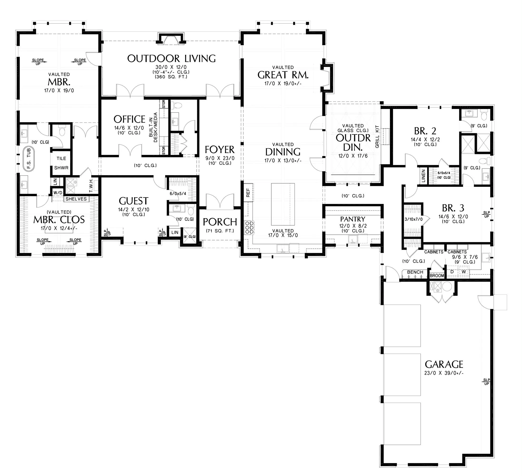 If you're in the market for a luxury transitional design on one level, House Plan 5881 is here for your consideration! This sprawling 3,704-square-foot layout has so much for a family to enjoy from the open-concept living space for hosting, to the split bedrooms for privacy, to the outdoor areas that add even more functionality. When you step inside the foyer, you'll find the great room lined up beneath a vaulted ceiling on the righthand side, from the large island kitchen in front to the view-capturing family room in back. But that's not all--there's also a dedicated outdoor living area with a fireplace accessible from the end of the foyer hallway and a separate outdoor dining area that connects to the indoor dining from the other side. Just imagine how you could host with this! On the lefthand side of the foyer, you'll find a hallway with a powder room, office, guest bedroom suite, and the grand master suite with a five-piece bath and vaulted ceilings in the bedroom and walk-in closet. The other two bedrooms--both suites themselves--are in the hallway beyond the kitchen along with the walk-through pantry, laundry, and mudroom coming in from the three-car garage. House Plan 5881 is a unique design that checks all the boxes and more!