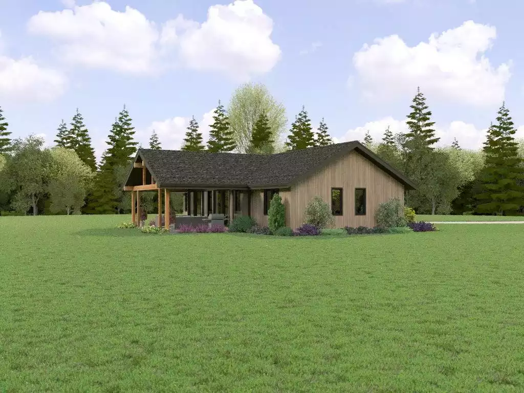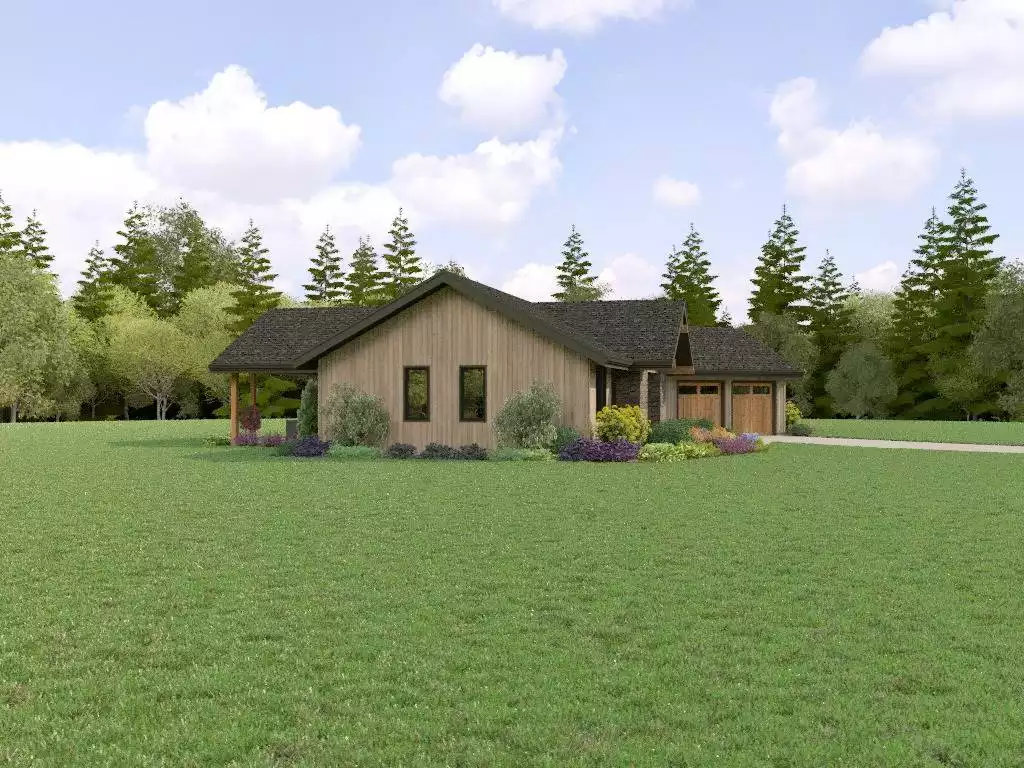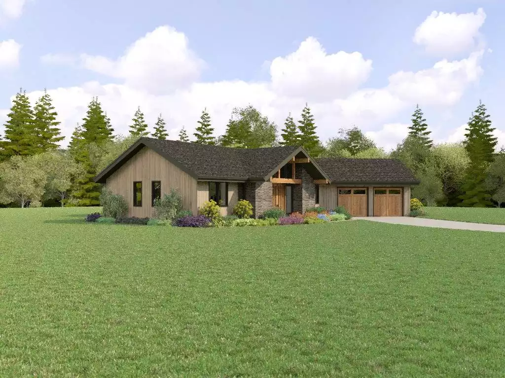 Perfect for those with mid-century tastes, House Plan 10277 is a modern ranch with beautiful curb appeal, and angled garage, and 1,910 square feet complete with three bedrooms and two bathrooms. The design features large windows around the entry to flood the vaulted foyer with natural light. The bright gallery hallway across the front of the house places two bedrooms and a hall bath on one side and the spacious primary suite with a five-piece bath and the mudroom that connects to the garage on the other. The common areas are straight back from the foyer and include an island kitchen beside living and dining space, all beneath a vaulted ceiling. That vaulted ceiling even continues out over the covered porch! With a wall of windows between the indoor and outdoor living spaces, this home is made to take in views!
