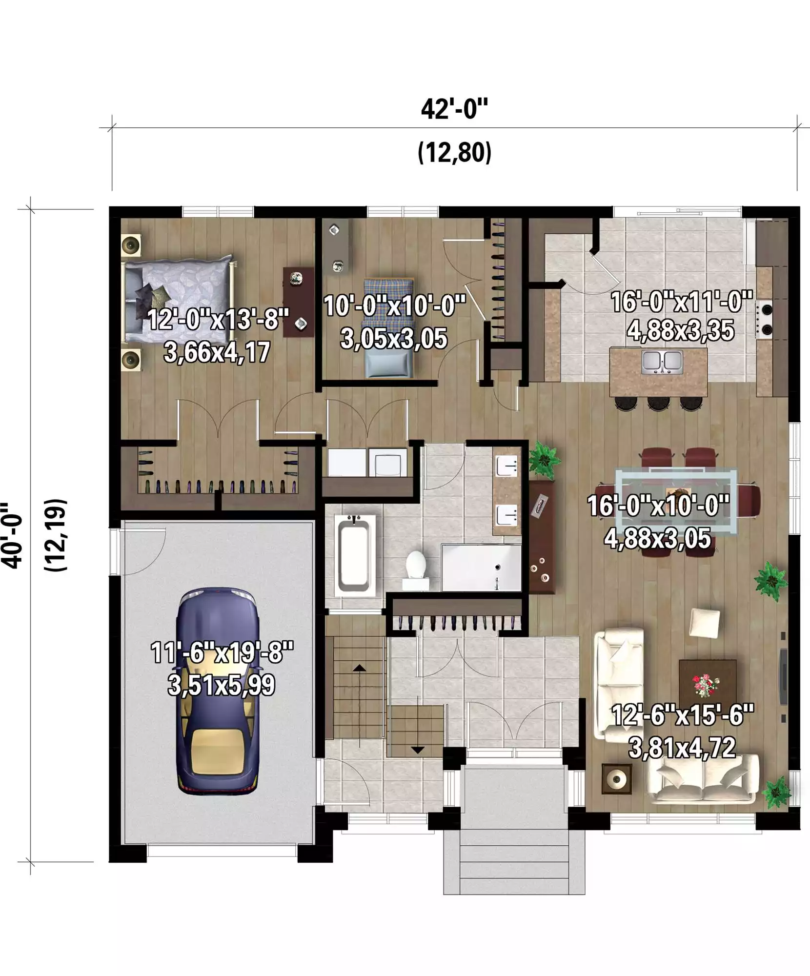 House Plan 10465 is the perfect smaller modern home for a neighborhood! This simply shaped design includes a one-car garage as part of its footprint while the 1,332-square-foot interior provides comfortable accommodations for a small family. When you enter, the foyer includes a coat closet and stairs down to the garage and then the basement. The common areas spread back on the other side of the house and are anchored by a unique U-shaped island kitchen in back. It has a patio door on the rear wall! Both bedrooms are tucked away in the back hallway along with the five-piece hall bath and the laundry. Make sure to notice the window in the bathroom--even though this room is in the center of the house, it's designed to borrow light from the entryway!