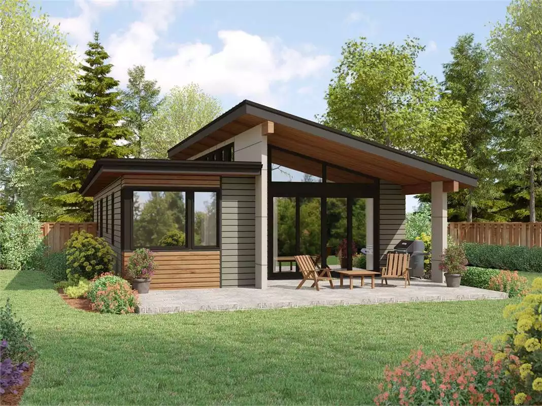 If you're in the market for a narrow modern ranch of modest size, House Plan 6689 would make a great choice! It's only 30' across and offers 1,483 square feet, three bedrooms, and two bathrooms along with a one-car front-entry garage. Step inside and a foyer leads you in. On one side, a small hallway includes the entry from the garage, a built-in bench, and the laundry room. On the other, there's another hallway with two bedrooms separated by a hall bath. The great room at the end of the foyer spreads back from the L-shaped island kitchen through the dining and living areas, all beneath a vaulted ceiling with beautiful clerestory windows. The primary suite is placed at the rear of the house and has a private four-piece bath with dual vanities and a stall shower. A covered porch rounds out this design!