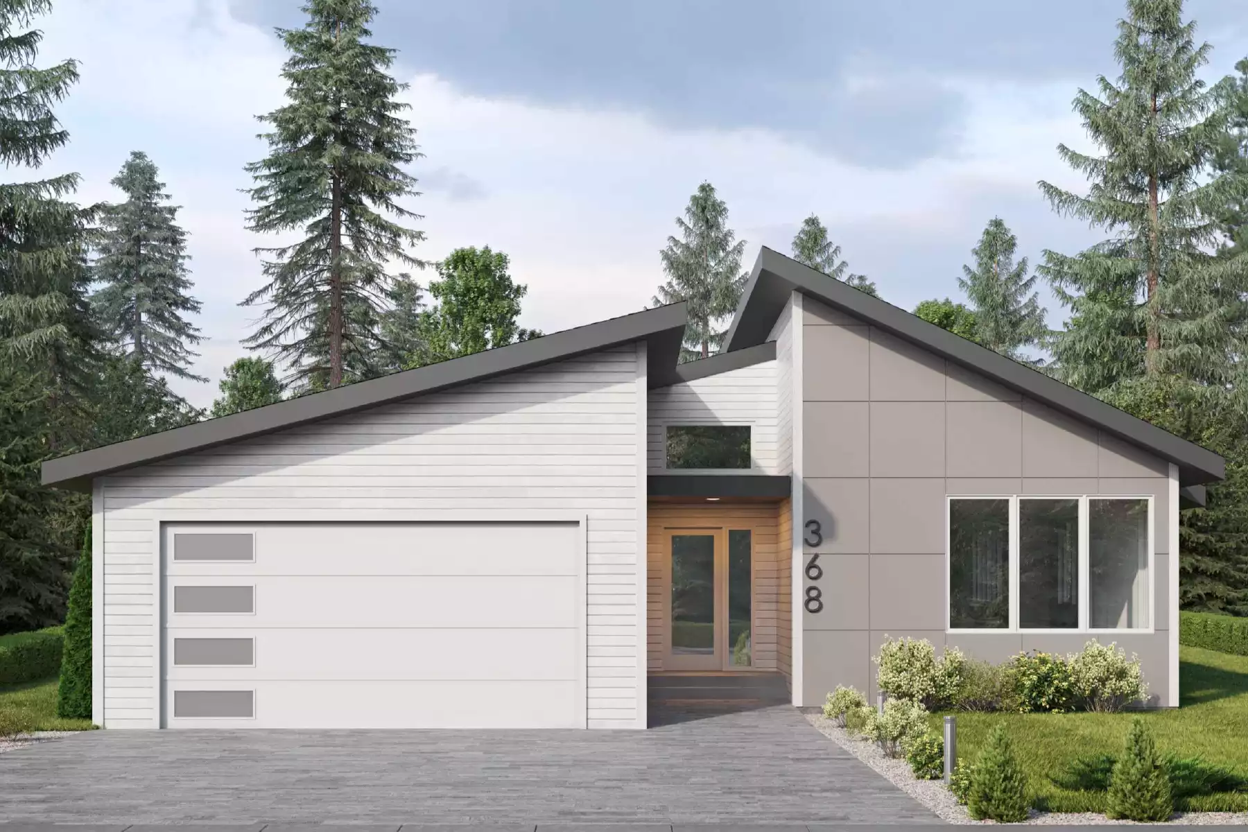 Looking for an affordable modern home? See what House Plan 2384 has to offer in 1,756 square feet! Sharp shed rooflines rise up over the front entry to draw the eye to the door. Inside, the vaulted foyer has a bench at the end and connects directly to the vaulted open-concept living spaces on one side and the hallway with all three bedrooms on the other. From the L-shaped island kitchen to the great room with a fireplace, the common areas have plenty of windows for natural light. The hallway behind the garage hosts the four-piece primary suite, two secondary bedrooms, a hall bath, and the laundry, so you'll enjoy clearly defined zones in this compact design!