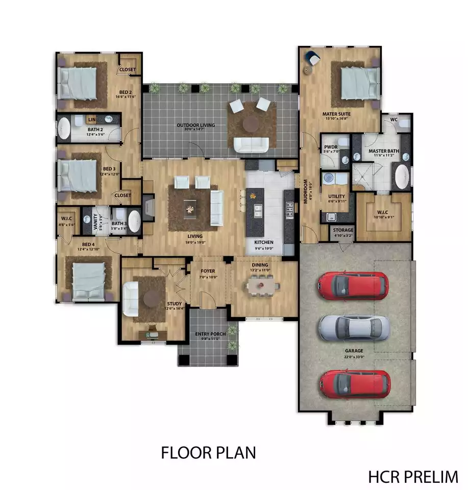 Greyrock is a stunning 2,680 square foot modern home with a brick and stone exterior that offers both style and comfort. This one-story design features four spacious bedrooms, including a private split-bedroom layout, three and a half bathrooms, a dedicated study, and a formal dining room. The open floor plan connects the living room and kitchen, which boasts a large island with bar seating—perfect for entertaining. A generous outdoor living space and a three-car garage complete this beautifully designed home.