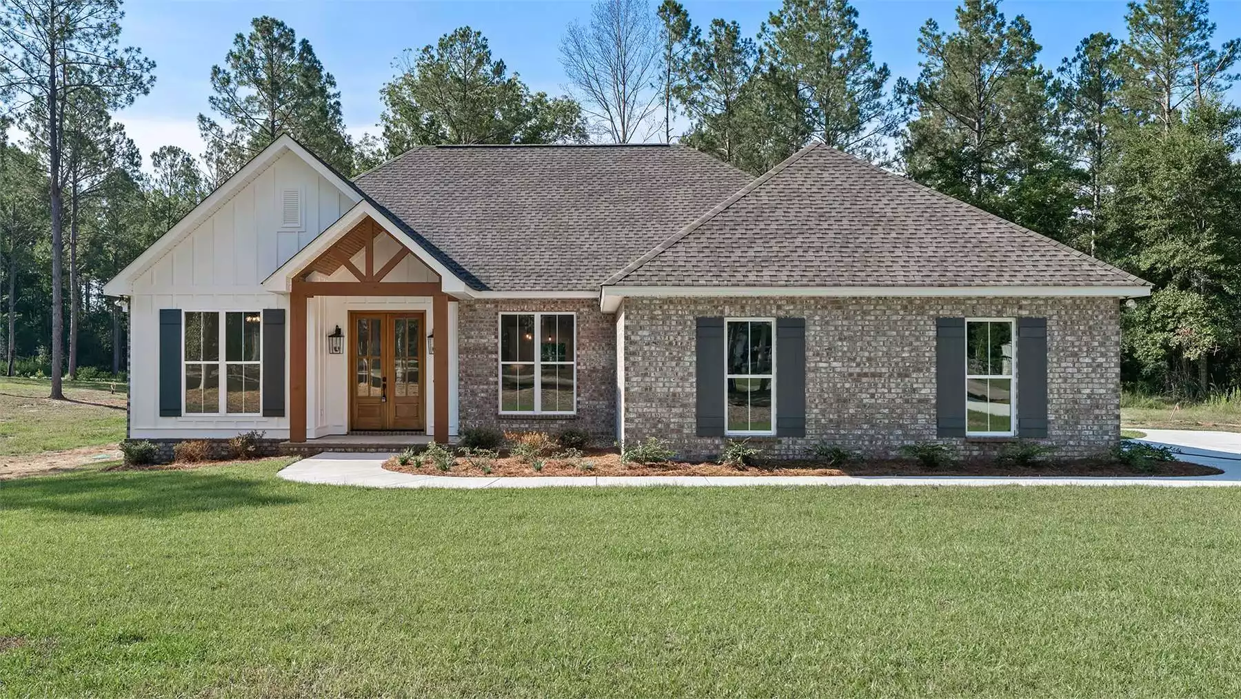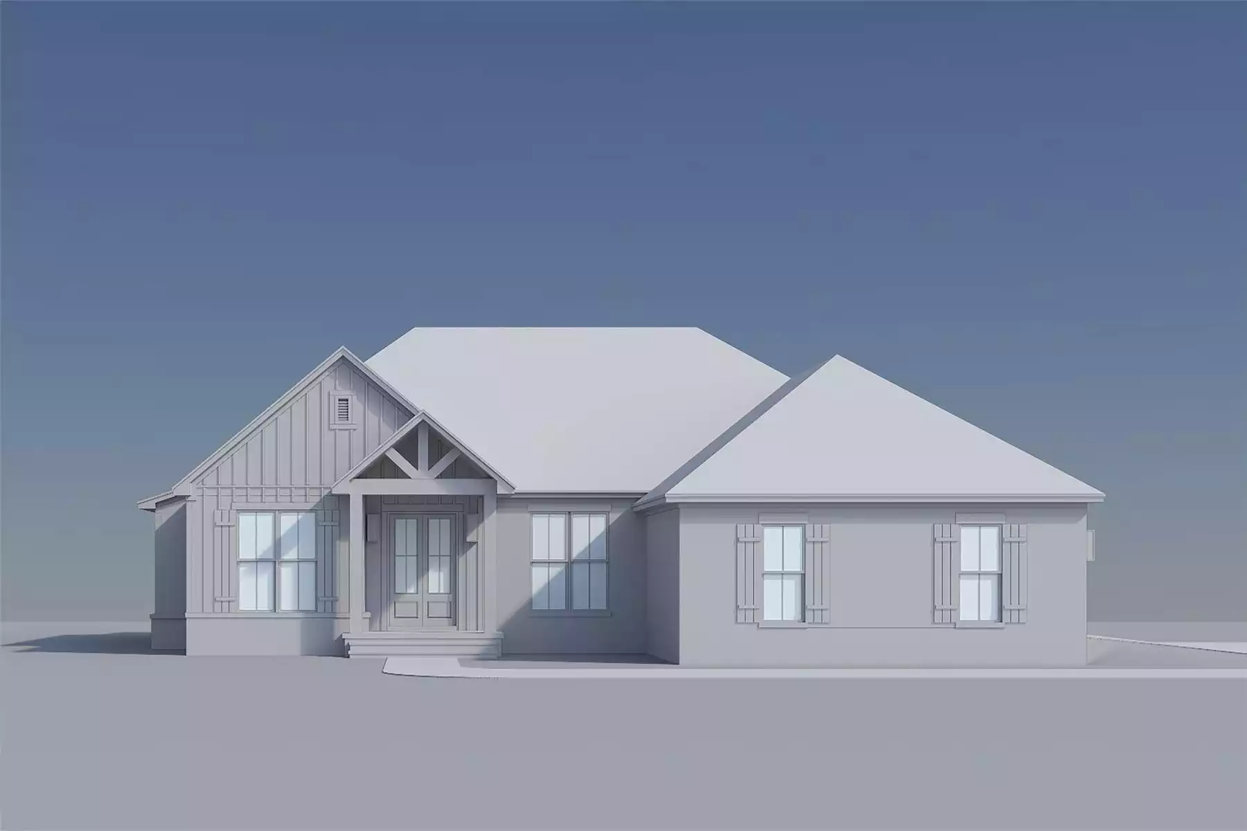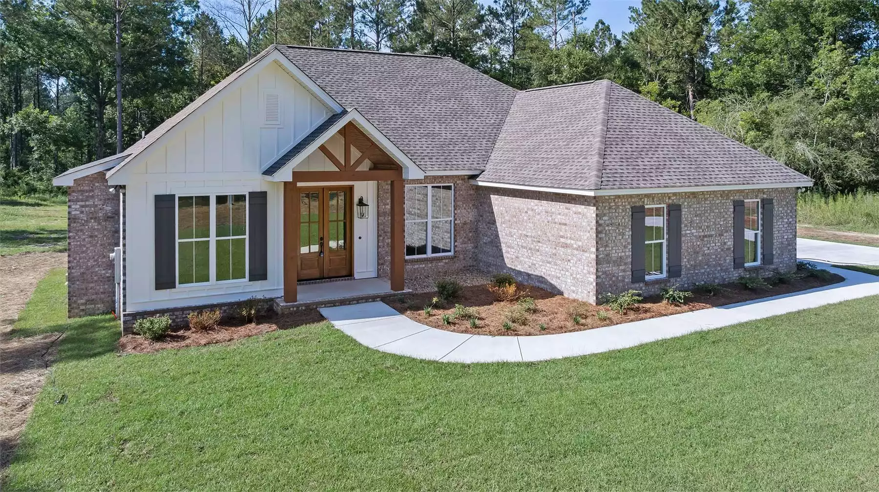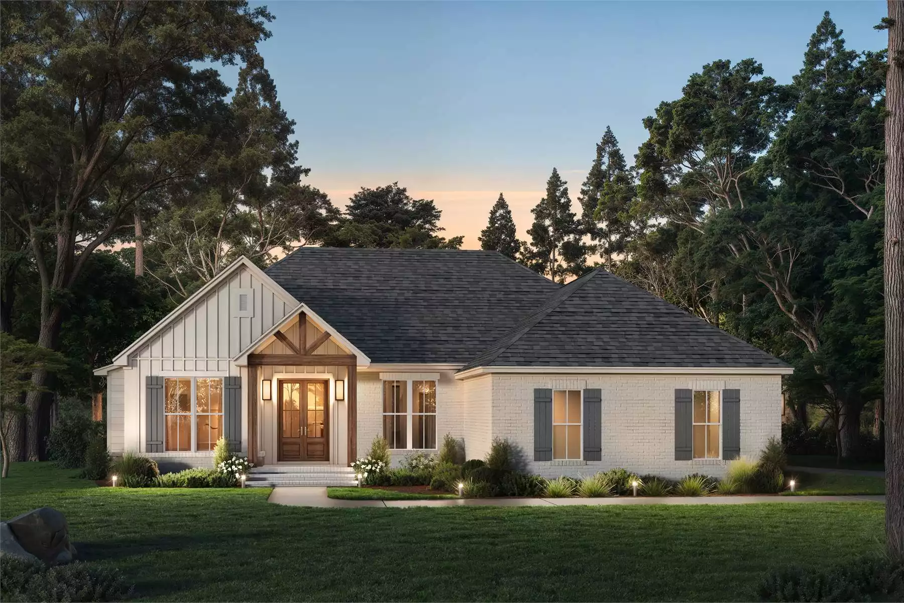 This charming 1,880 square feet plan welcomes you with a covered front porch and a warm, open layout designed for comfortable family living. The vaulted great room creates an airy sense of space, flowing easily into the dining area and L-shaped kitchen with a large island and butler's pantry. A main floor primary suite offers privacy and convenience, complete with a double vanity, walk-in closet, and separate tub and shower. Three additional bedrooms are arranged thoughtfully in a split-bedroom layout, giving everyone their own corner of the home. The mud room and first-floor laundry add everyday practicality, while the rear porch extends living outdoors. Storage spaces throughout the plan help keep things organized and clutter-free. With its inviting layout and warm farmhouse character, this home is designed for easygoing days and memorable family moments.