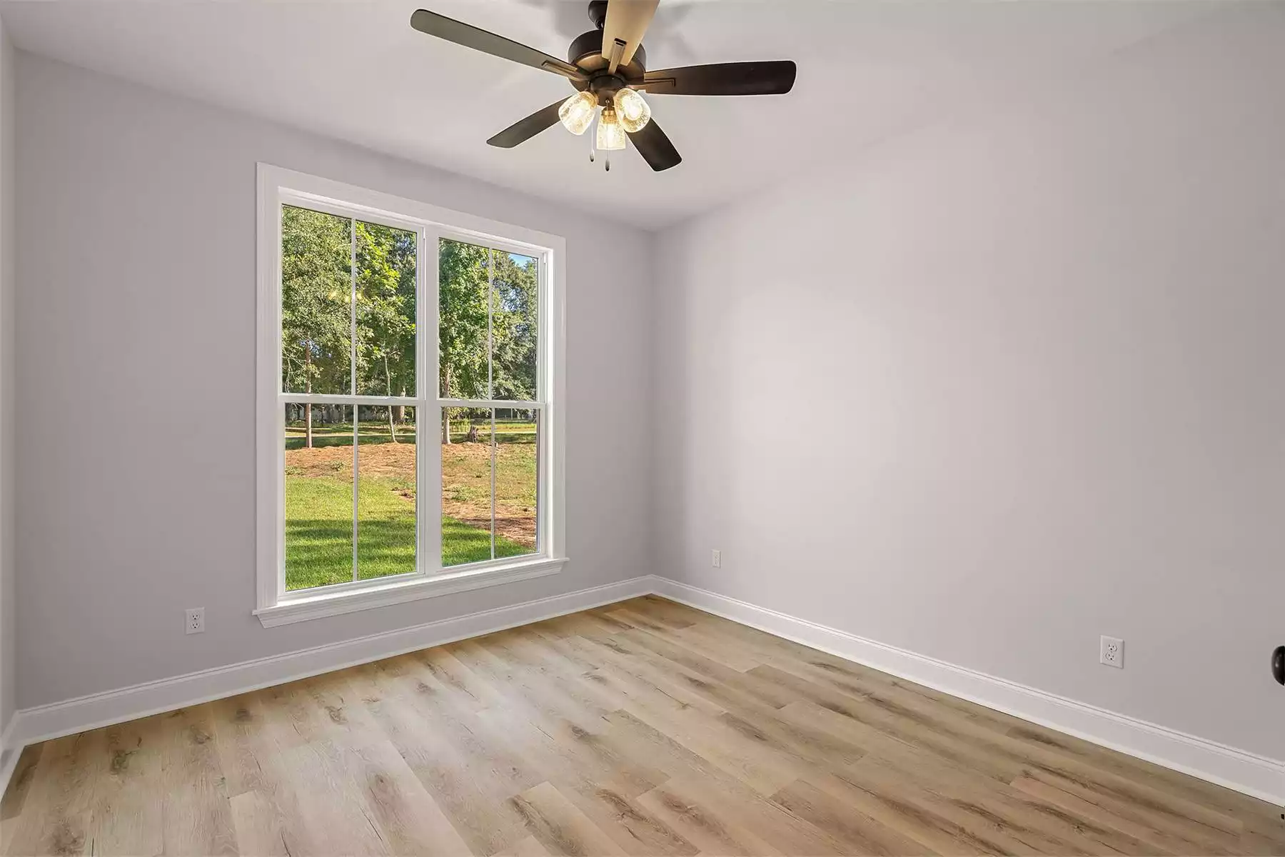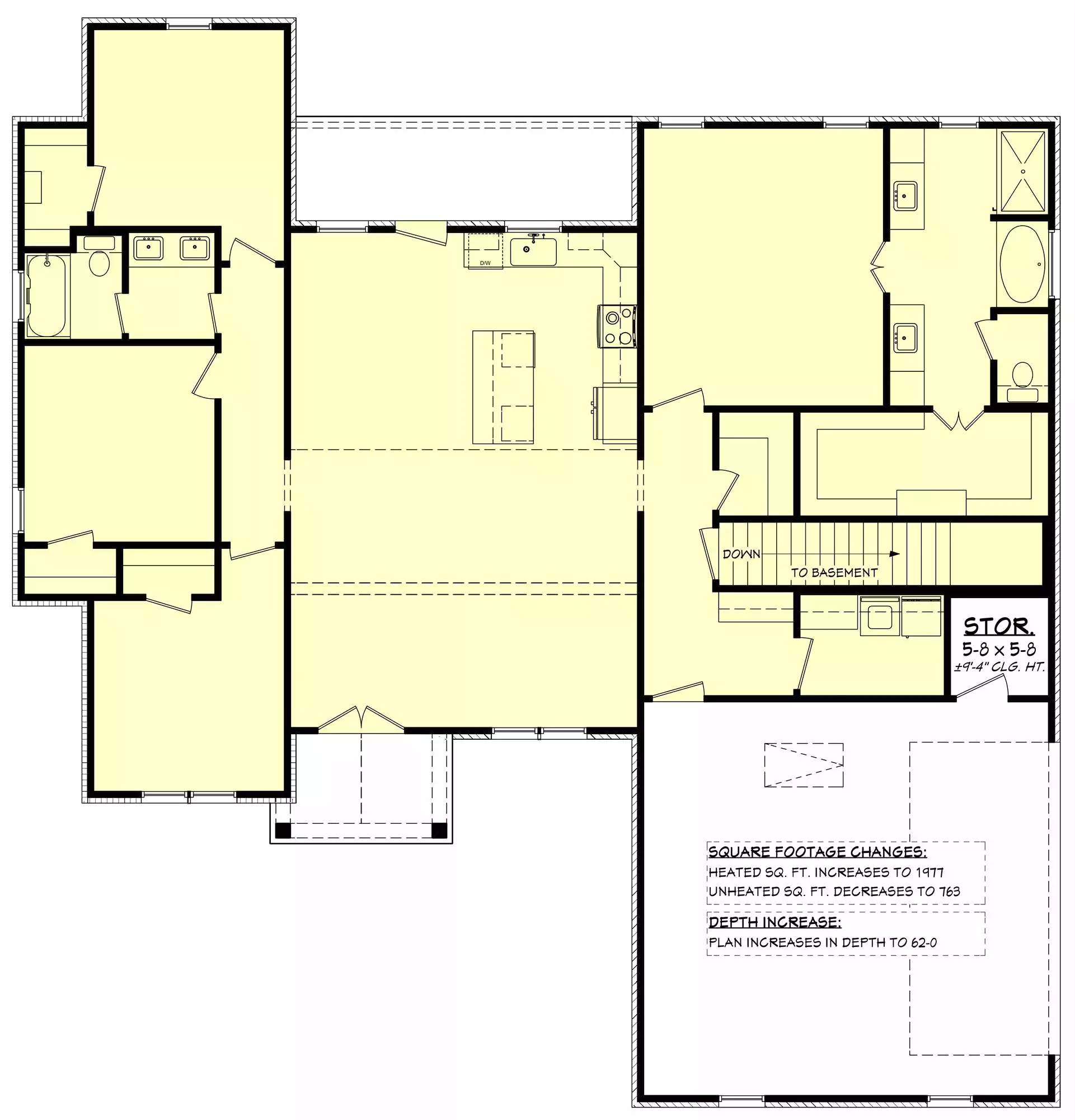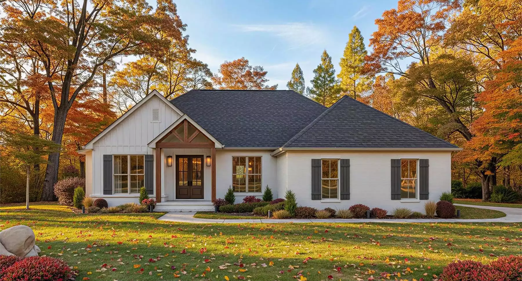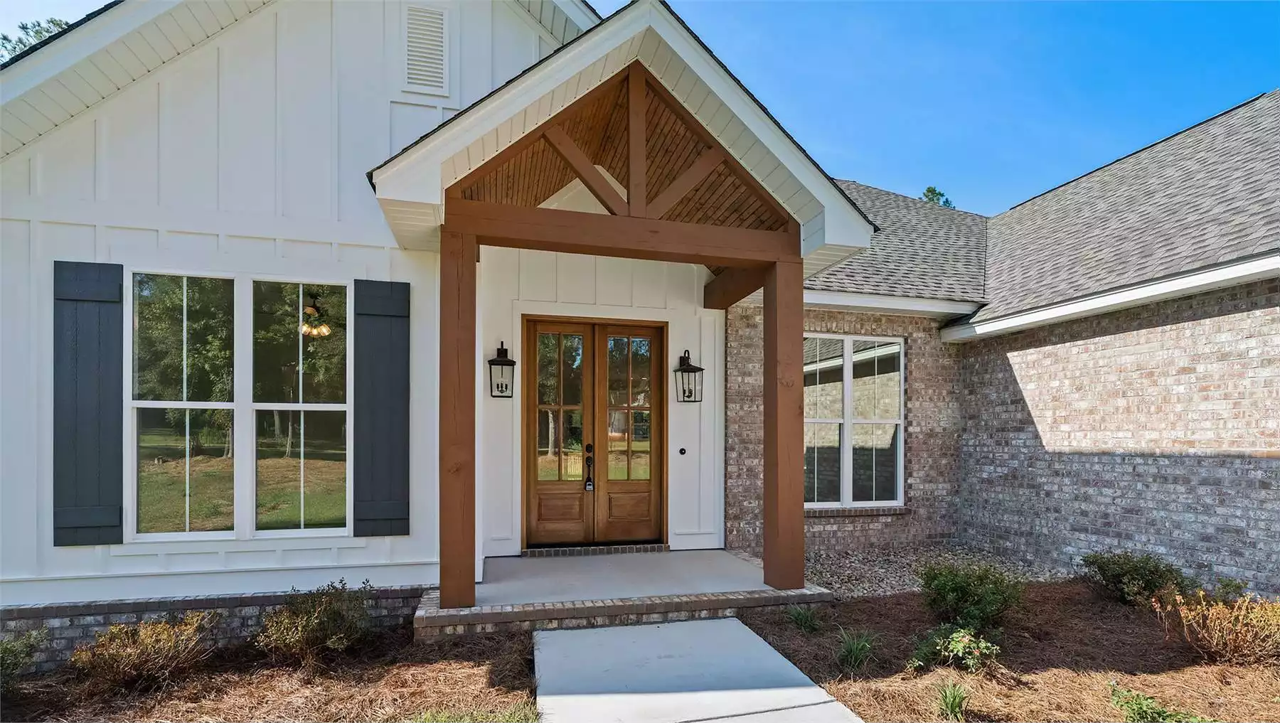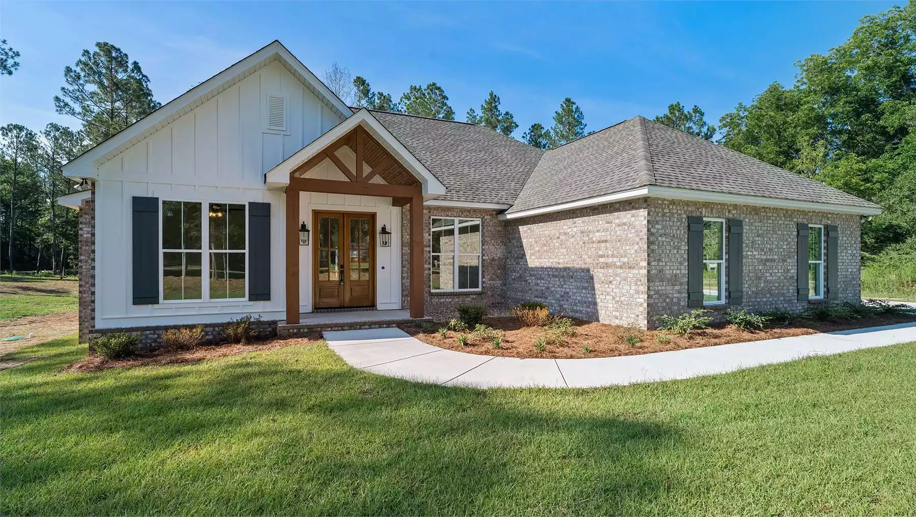 This charming 1,880 square feet plan welcomes you with a covered front porch and a warm, open layout designed for comfortable family living. The vaulted great room creates an airy sense of space, flowing easily into the dining area and L-shaped kitchen with a large island and butler's pantry. A main floor primary suite offers privacy and convenience, complete with a double vanity, walk-in closet, and separate tub and shower. Three additional bedrooms are arranged thoughtfully in a split-bedroom layout, giving everyone their own corner of the home. The mud room and first-floor laundry add everyday practicality, while the rear porch extends living outdoors. Storage spaces throughout the plan help keep things organized and clutter-free. With its inviting layout and warm farmhouse character, this home is designed for easygoing days and memorable family moments.