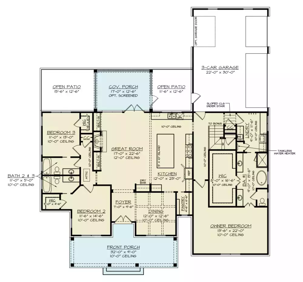 Welcome to this stunning country farmhouse plan, where elegance meets practicality. As you enter through the double front doors, a foyer sets the tone for the home's charm. To the right, a formal dining room with a beamed ceiling invites you to host guests and enjoy festive feasts. The heart of the home is the open floor plan, featuring a high ceiling in both the kitchen and great room. The great room boasts a fireplace with built-in shelves, creating a warm atmosphere. Double doors seamlessly connect to the screened-in rear porch and open patios. The kitchen, with its large island and strategically placed walk-in pantry, is a culinary haven. The luxurious master suite on the right side offers a soaking tub between a walk-in shower and a private toilet water closet. Twin sink vanities flank the entrance to a walk-in closet, and a discreet pocket door leads to the adjacent laundry room. On the opposite side, two additional bedrooms each have a walk-in closet and private full bath. Explore the optional upper level, with a full bath off the landing and a vaulted hallway leading to two bonus rooms above the garage and master suite. At the rear, a spacious three-car garage ensures ample room for family vehicles and storage. Welcome to a home that seamlessly combines style with functionality.