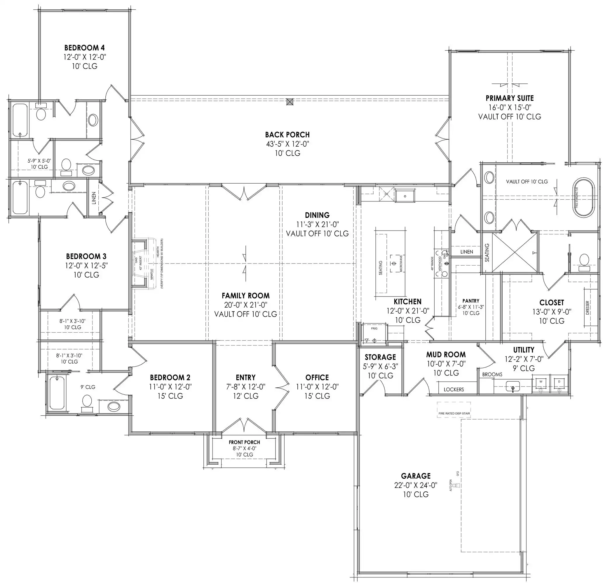 Each set of construction documents includes detailed, dimensioned floor plans, basic electric layouts, cross sections, roof details, cabinet layouts and elevations, as well as general IRC specifications. They contain virtually all of the information required to construct your home. The typical plan set does not include any plumbing, HVAC drawings, or engineering stamps due to the wide variety of specific needs, local codes, and climatic conditions. These details and specifications are easily obtained from your builder, contractors, and/or local engineers.
