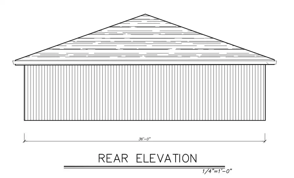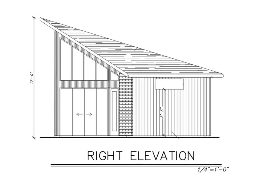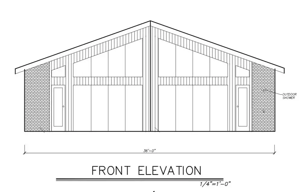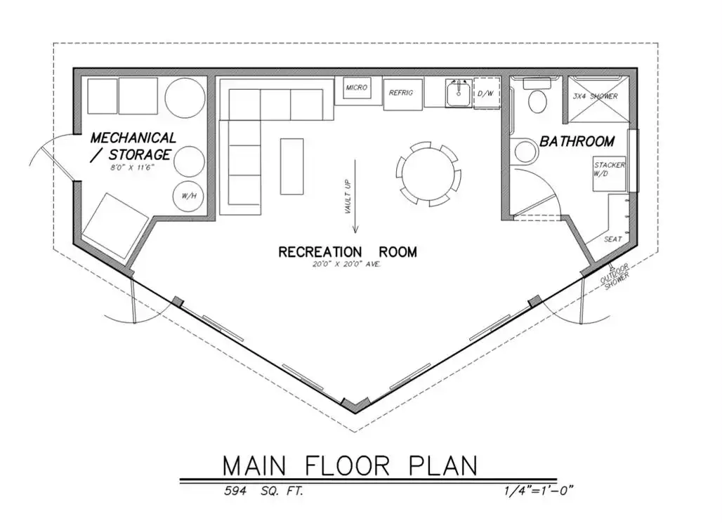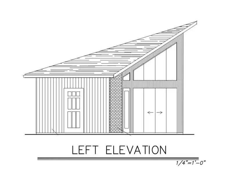 Need a striking modern pool house to complement your home? Plan 11765 could be your perfect fit! This unique design packs 594 square feet into a pentagonal footprint, and a dramatic single roof pitch rises up to help create a stunning rec room with a vaulted ceiling inside. It has a kitchenette and plenty of space for furniture, so you can set it up for lounging or games. There's also a full bath, of course, plus an additional outdoor shower. A pair of four-panel patio doors help blur the line between indoors and out, plus high windows brighten the whole interior. This plan really stays true to its modern inspiration!