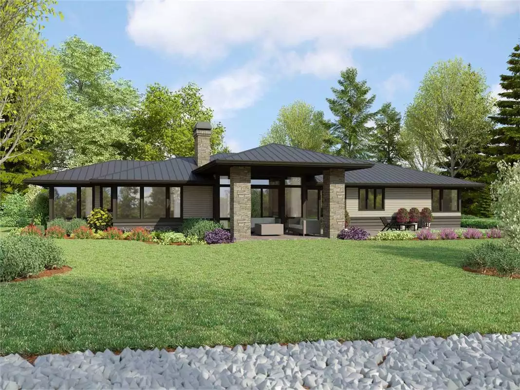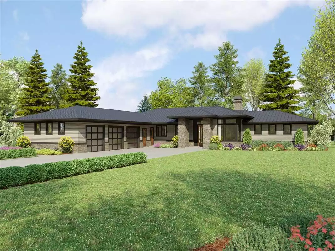 If you're a fan of mid-century modern or Prairie-style homes, House Plan 9293 could be the ranch for you! This roughly L-shaped home features a three-car garage with motorcourt entry in front and a sprawling 2,911-square-foot layout with three or four bedrooms and three bathrooms on one level. Step inside through the front door and the foyer looks across a gallery hallway to the living area in the great room. The open-concept common spaces spread across the back of the house with a U-shaped island kitchen on one side, dining space with a built-in buffet in the middle, and the living area with a fireplace and access to the covered outdoor living on the other. Head back to the gallery hallway to connect to the rest of the house. The five-piece primary suite and a den/bedroom are placed to the right of the great room while a full bath and a sizable utility/laundry/mudroom with built-ins and a freezer sit in front of the kitchen/dining. Continue to the far left and two bedrooms share a Jack-and-Jill bathroom between them. This design checks the boxes and has classic appeal to go along with its chic styling!