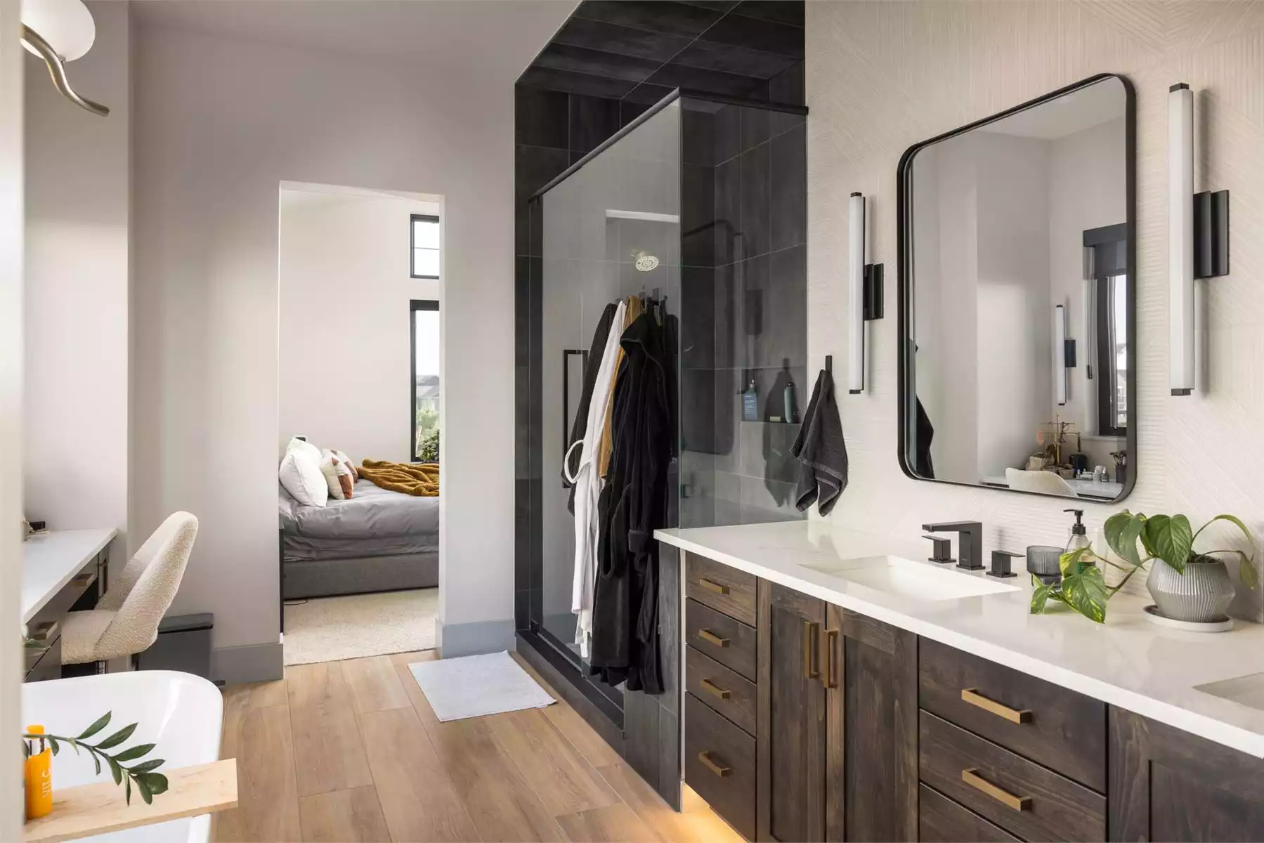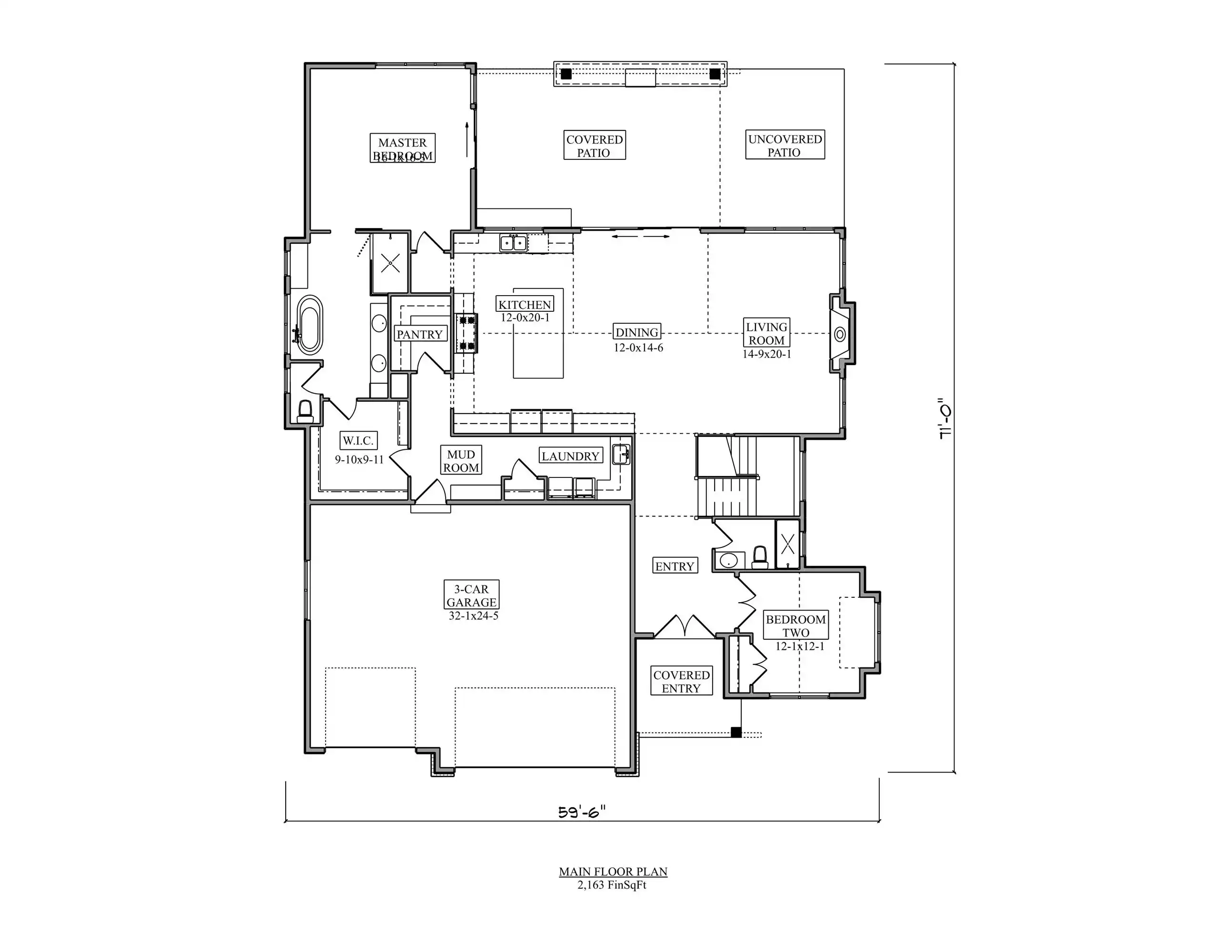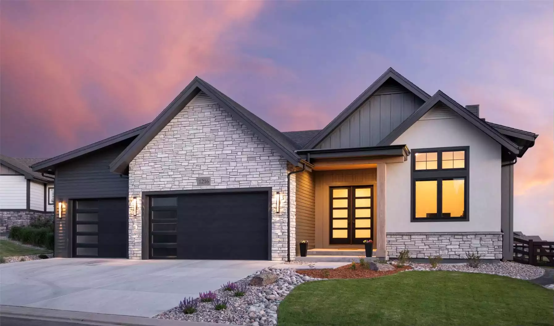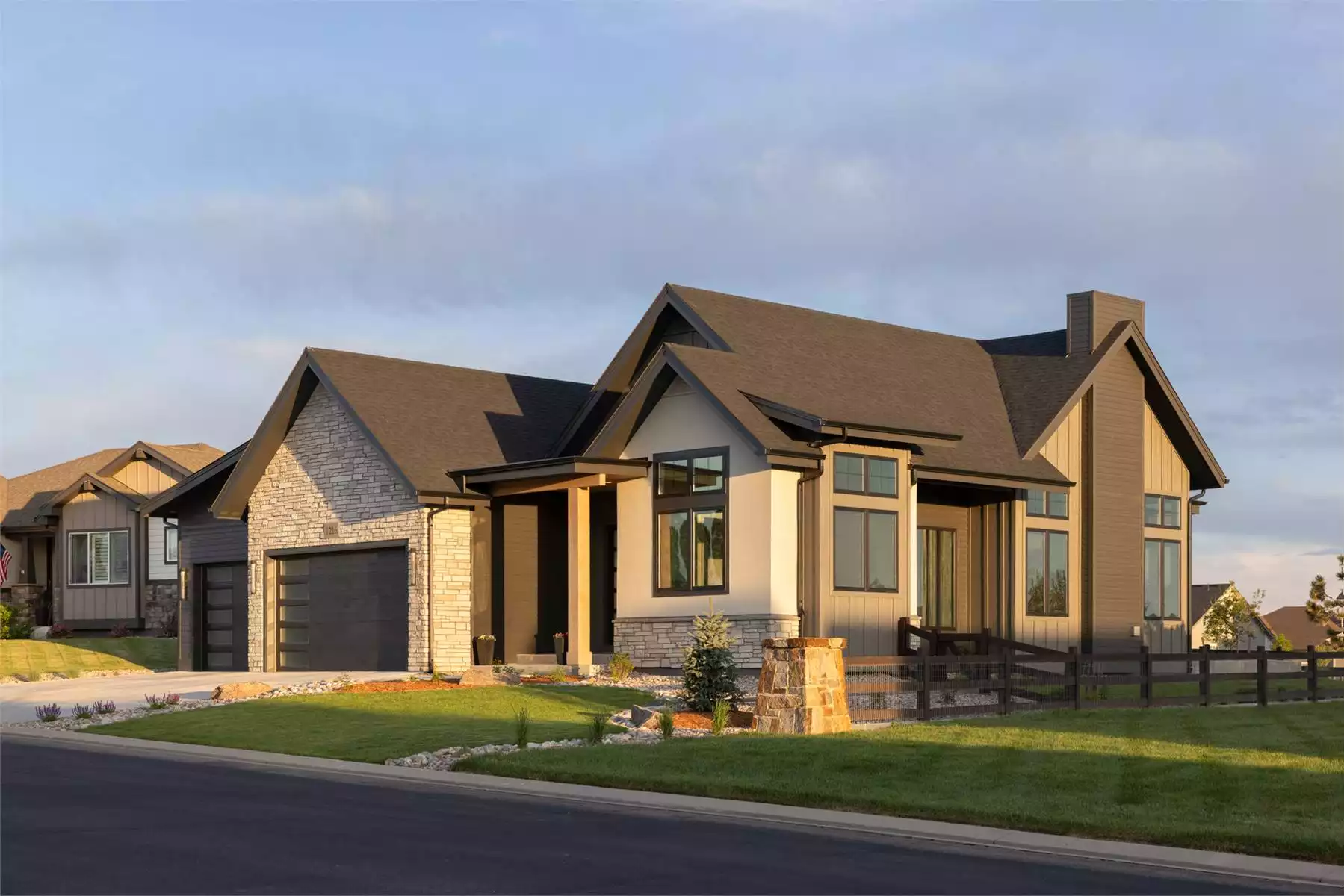The Coldcrest is a chic mountain-style home with a smart, single-story layout and a front-facing three-car garage. Spanning 2,163 square feet, it offers 2 bedrooms and 2.5 bathrooms, with the option to double the living space by adding a finished lower level—complete with 2 additional bedrooms, a full bath, and a spacious rec room. Inside, the split-bedroom design enhances privacy, with the first bedroom located at the front of the home and the luxurious primary suite tucked away on the left side. The primary bedroom boasts spa-like features, including a large bathroom with a separate soaker tub, walk-in shower, dual vanities, and a generous walk-in closet. At the heart of the home is an open-concept living area, featuring a chef’s dream kitchen with a U-shaped design, expansive counter space, and an oversized central island—perfect for entertaining—all with easy access to the large rear outdoor living space and scenic views.T
