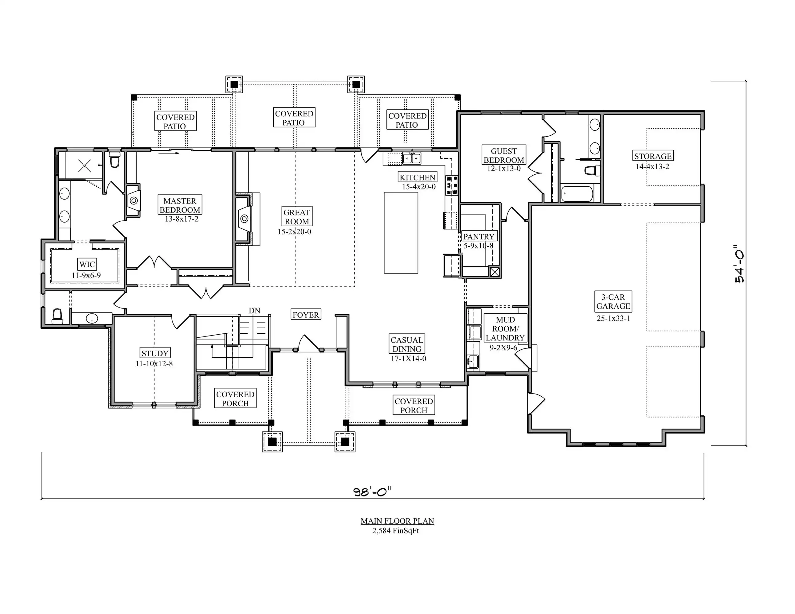 Ideal for those looking to settle down in nature, House Plan 10811 offers 2,584 square feet with two bedrooms and two-and-a-half bathrooms on one spacious level optimized for views. It also has a three-car garage on the side with an additional bay for storing any outdoor tools or gear you may need! Step inside the front door and the open-concept great room welcomes you into the heart of the home. The living space features a vaulted ceiling and a fireplace while the kitchen adjacent has a huge island beside a casual dining nook. The primary suite on the left side boasts a fireplace in the bedroom, direct connection to the back covered patio, and a four-piece bathroom with dual vanities and a stall shower. This hallway also includes the vaulted study and the powder room. Across the house, the guest suite has a divided four-piece bath. The laundry/mudroom that connects to the garage rounds out this perfectly apportioned home for small families or empty nesters!