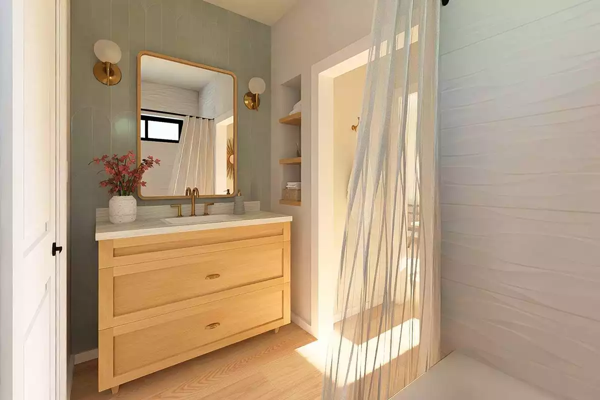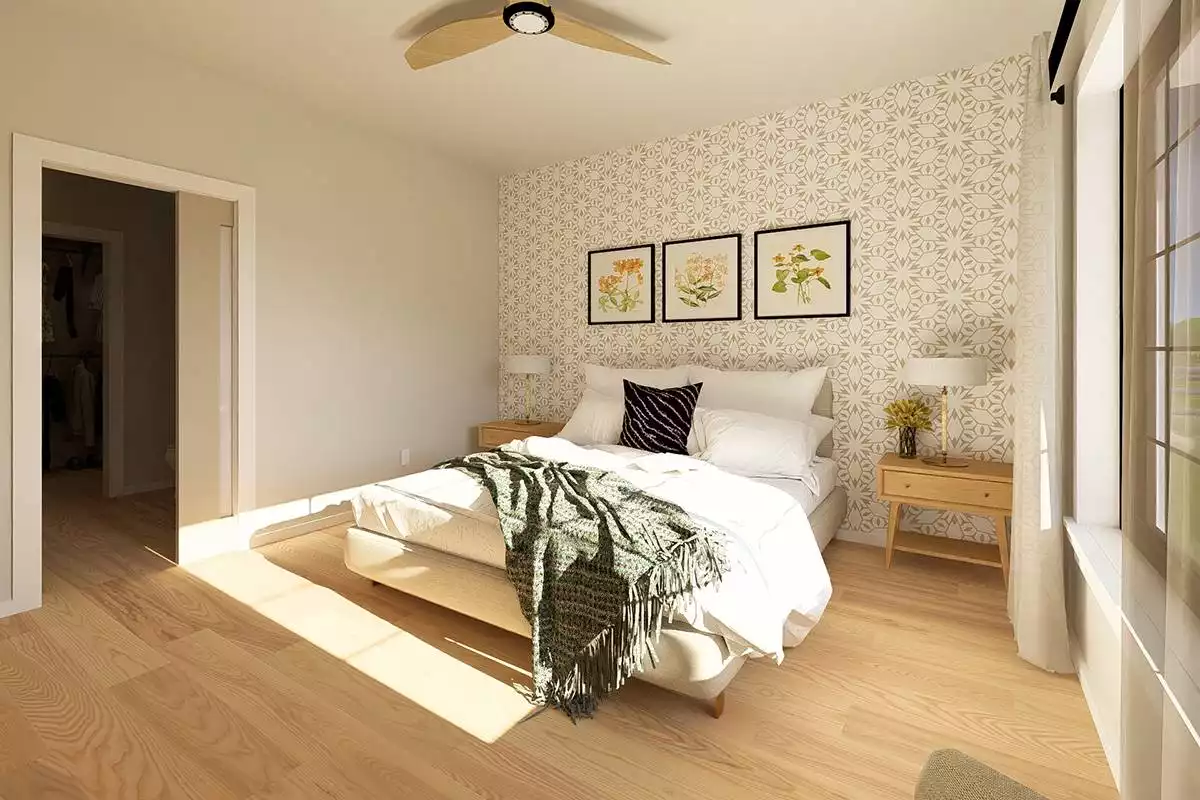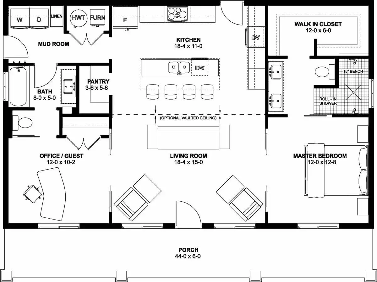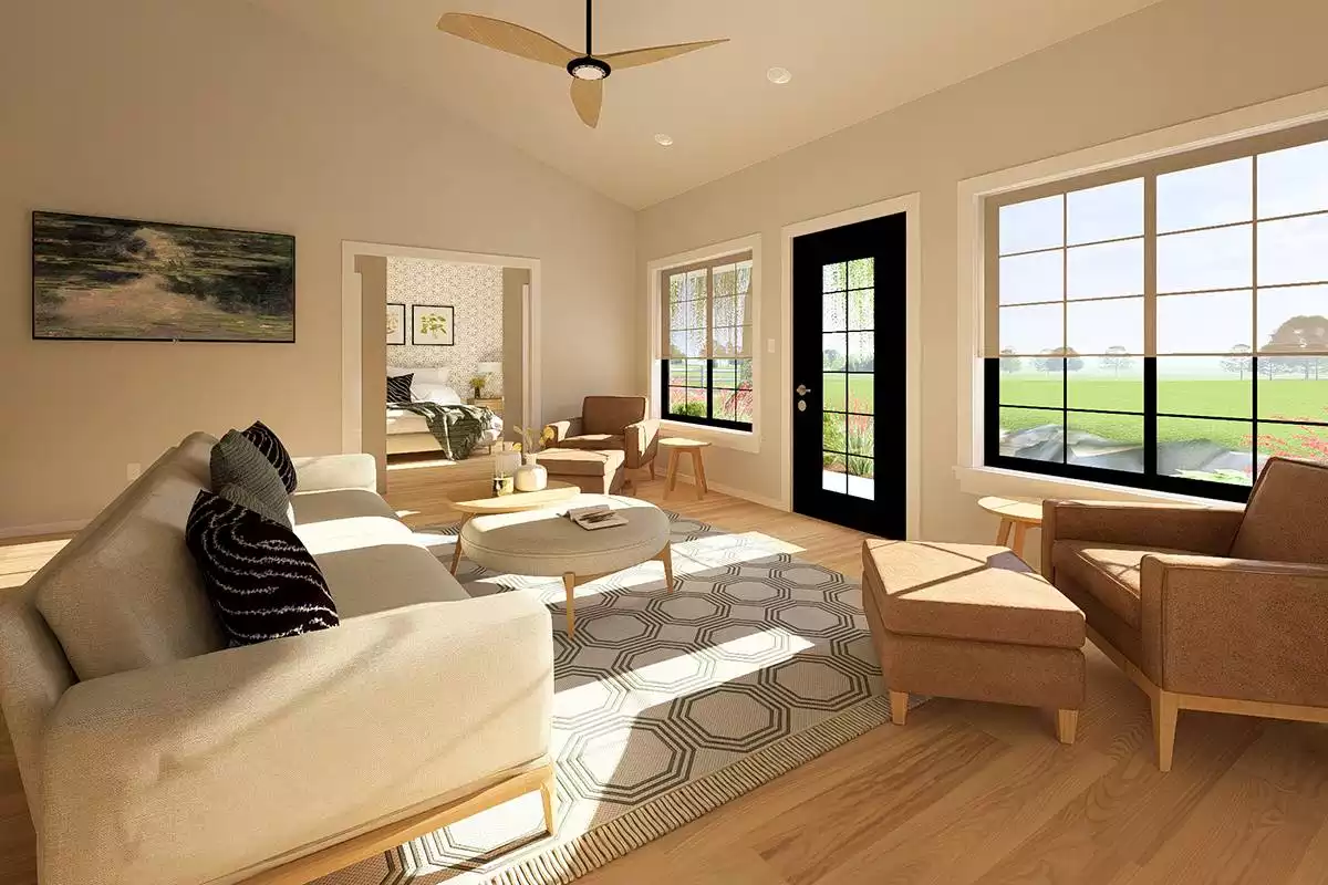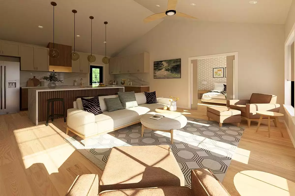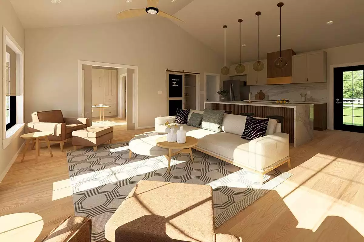 At 1188 square feet, this 2-bedroom, 2-bath home offers a roomy and thoughtfully designed layout centered around open, bright living. The open floor plan connects the great room and kitchen, where a 9.5-foot island provides seating for up to four and flows into a walk-in pantry for added storage. Optional vaulted ceilings rise to 13 feet 3 inches, enhancing the sense of space and natural light throughout the main living areas. Pocket doors create flexible transitions to the primary suite and guest room, allowing for privacy or a wide 5-foot opening for improved flow. The primary suite includes a spacious walk-in closet and a well-appointed bath with a dual vanity and a walk-in shower over 6 feet long with dual shower heads and a built-in bench. Accessibility is thoughtfully considered with 32-inch doors throughout, along with a mud room and laundry area featuring a linen cabinet and mechanical storage. A full guest bath and flexible second bedroom or home office add versatility, while the covered front porch creates a warm and welcoming outdoor living space.