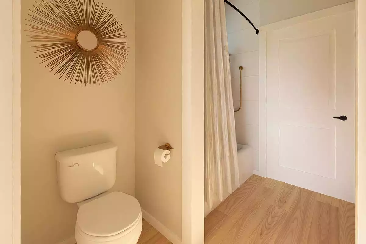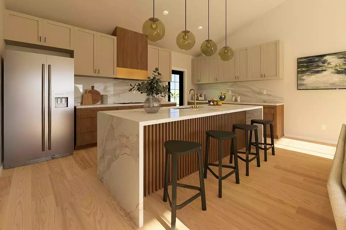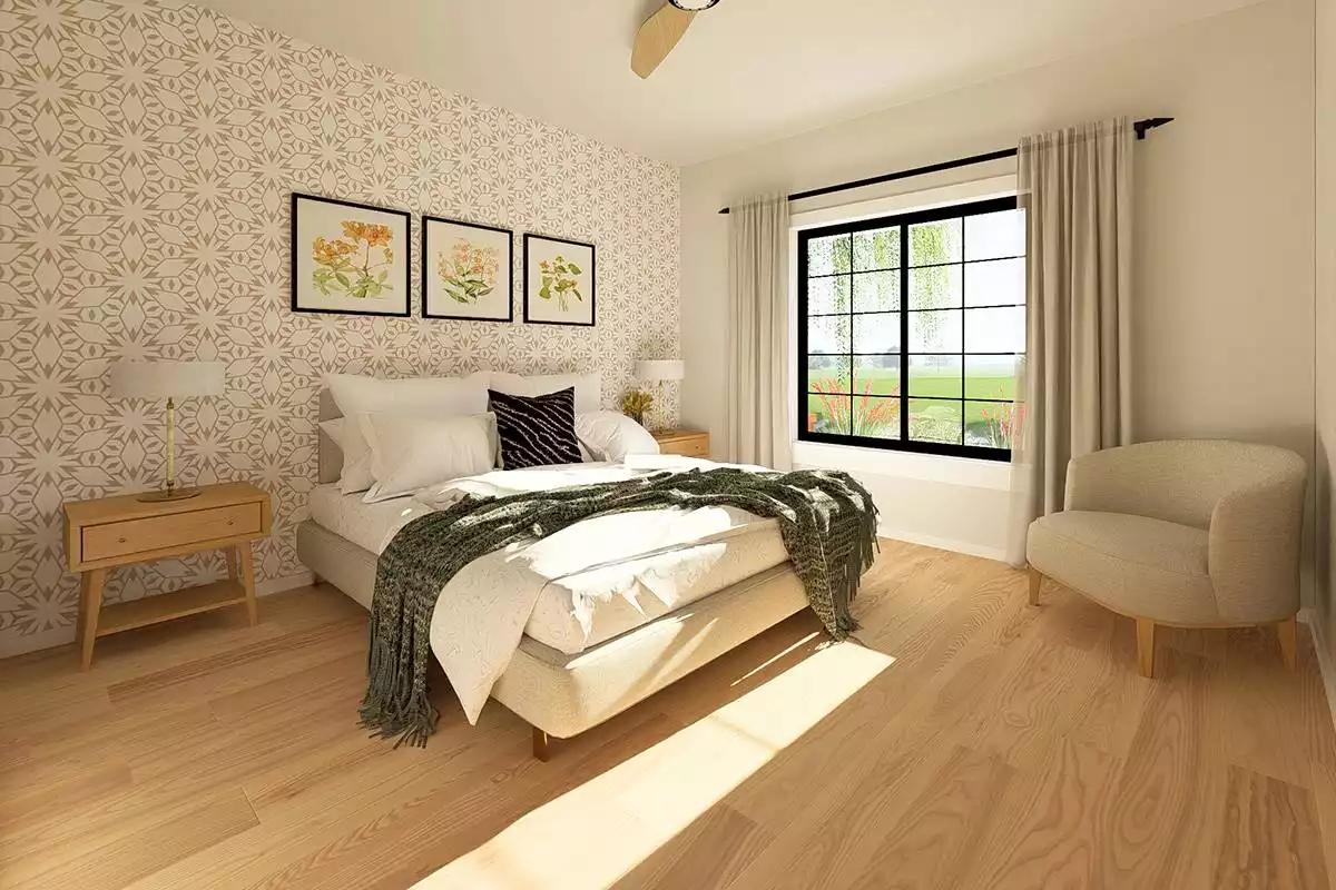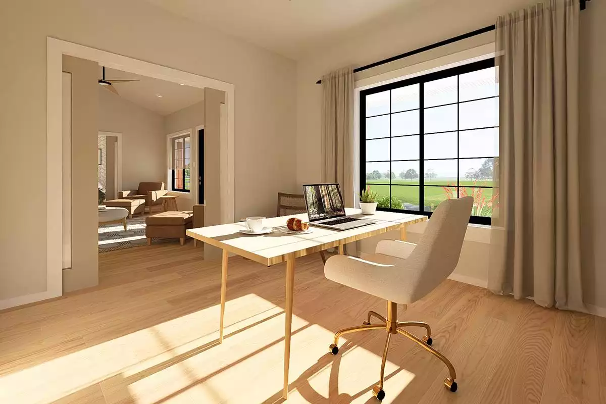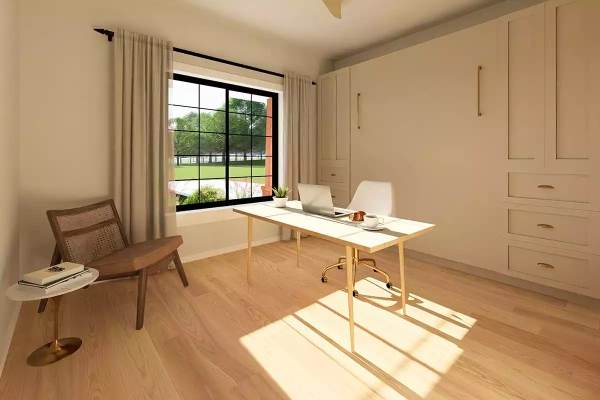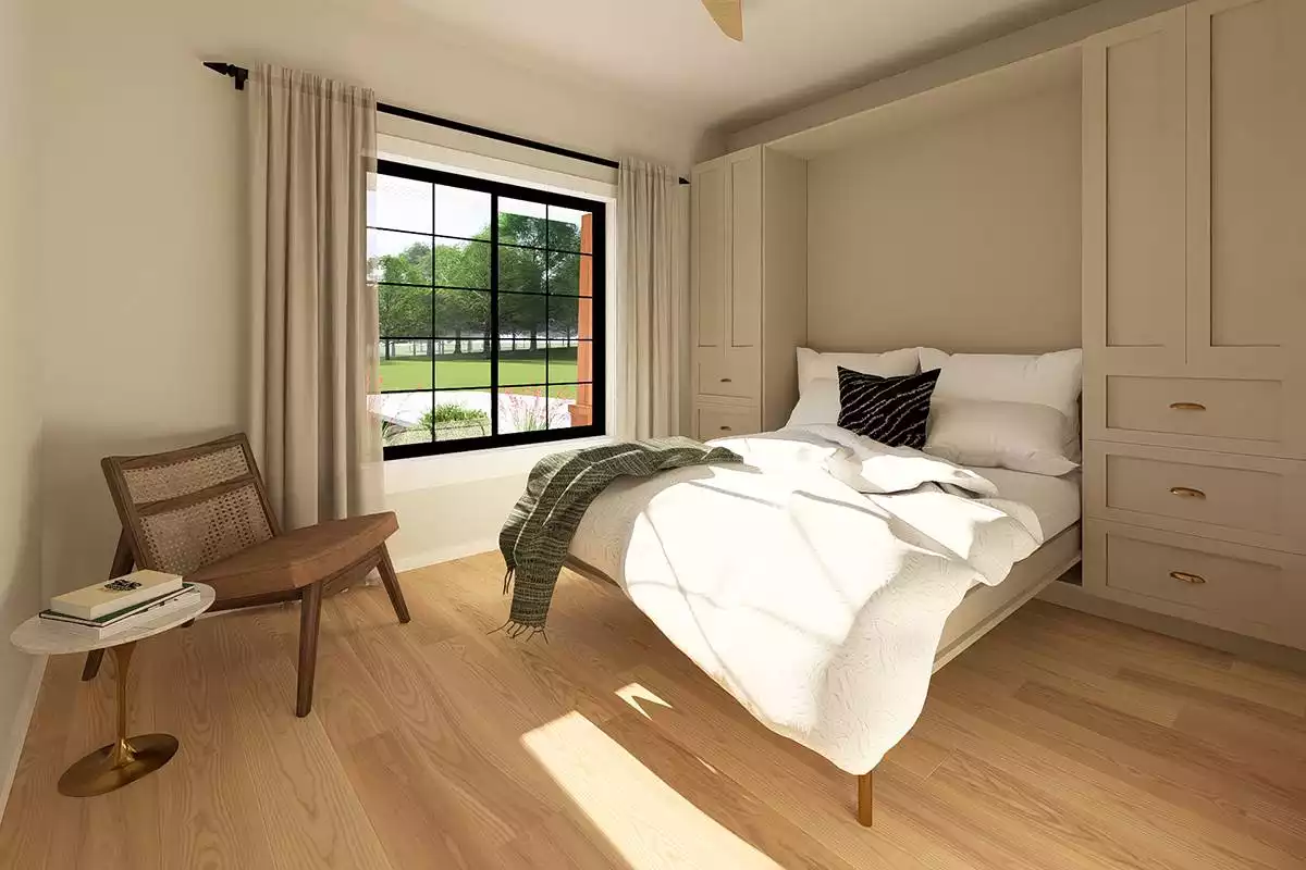 At 1188 square feet, this 2-bedroom, 2-bath home offers a roomy and thoughtfully designed layout centered around open, bright living. The open floor plan connects the great room and kitchen, where a 9.5-foot island provides seating for up to four and flows into a walk-in pantry for added storage. Optional vaulted ceilings rise to 13 feet 3 inches, enhancing the sense of space and natural light throughout the main living areas. Pocket doors create flexible transitions to the primary suite and guest room, allowing for privacy or a wide 5-foot opening for improved flow. The primary suite includes a spacious walk-in closet and a well-appointed bath with a dual vanity and a walk-in shower over 6 feet long with dual shower heads and a built-in bench. Accessibility is thoughtfully considered with 32-inch doors throughout, along with a mud room and laundry area featuring a linen cabinet and mechanical storage. A full guest bath and flexible second bedroom or home office add versatility, while the covered front porch creates a warm and welcoming outdoor living space.