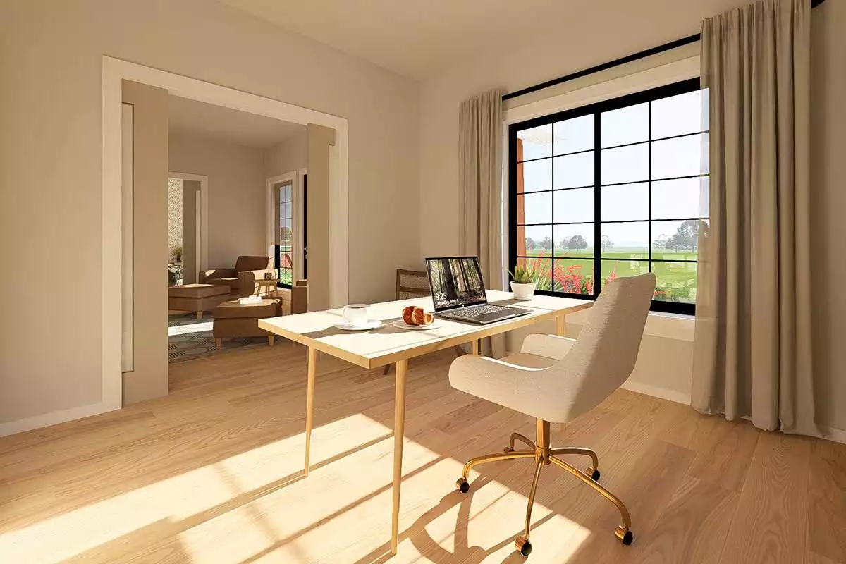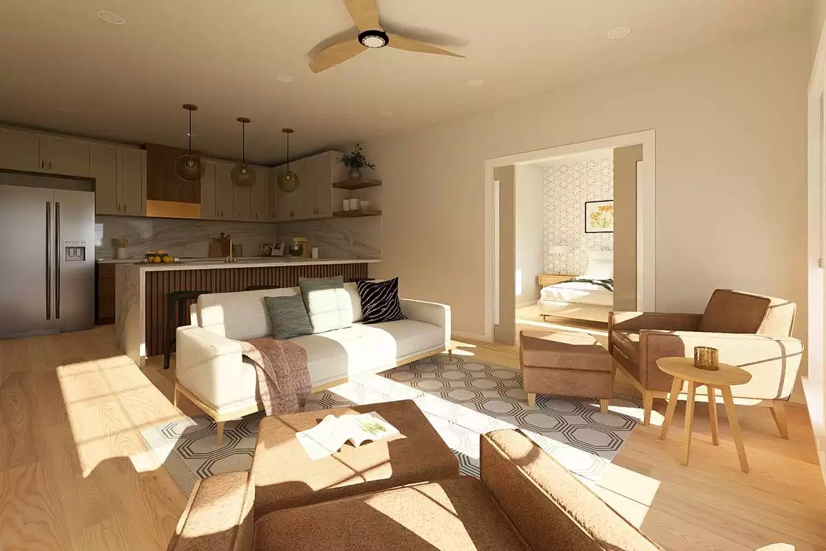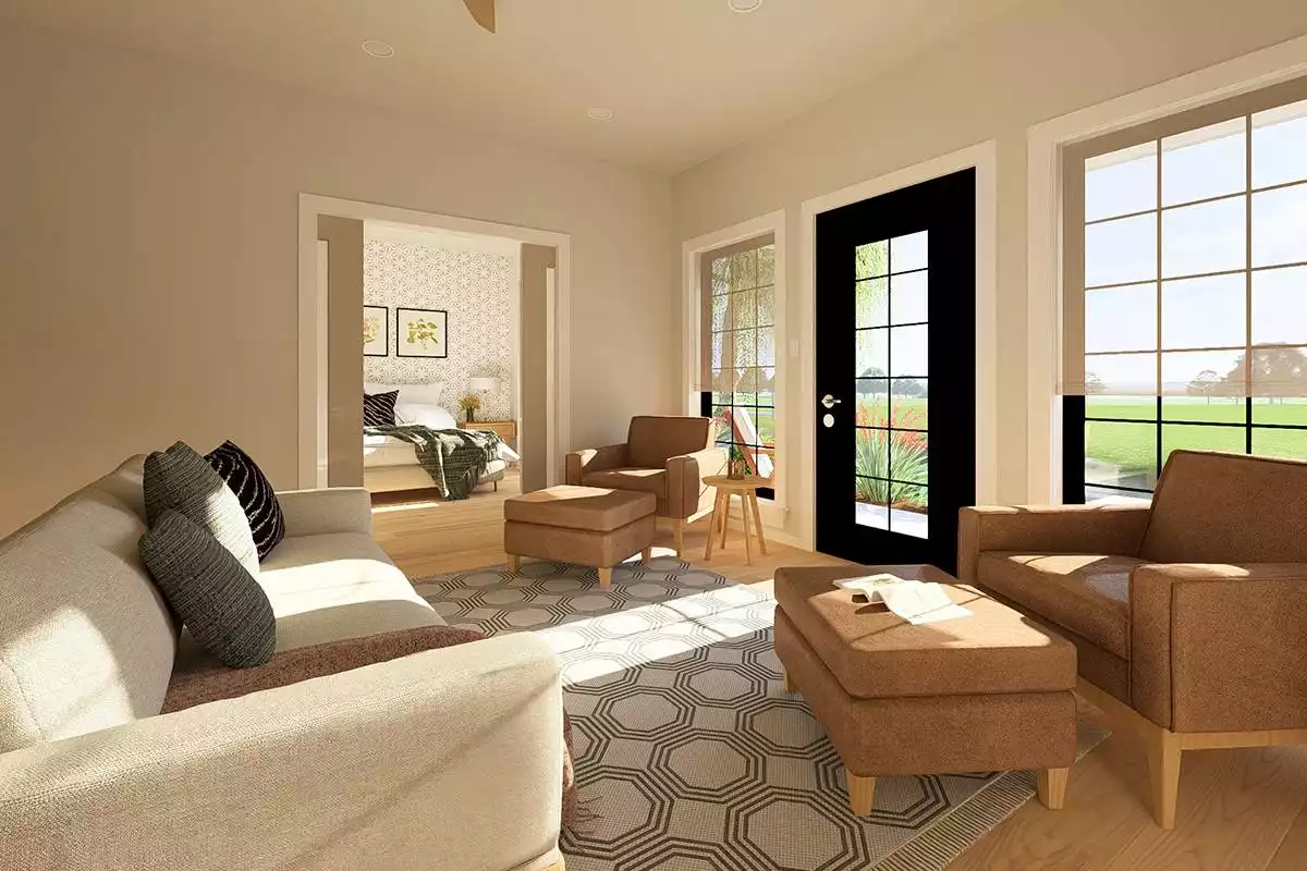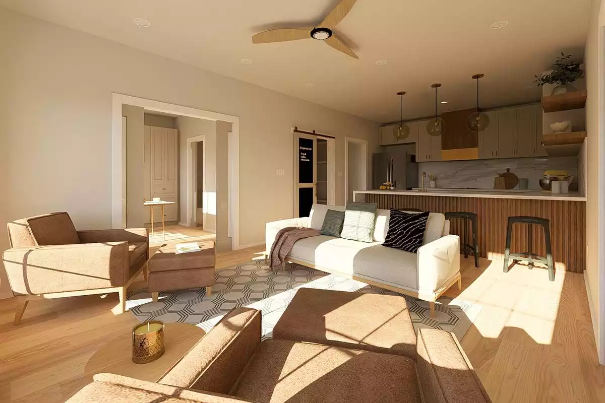 This 988 square feet home offers 2 bedrooms, 2 bathrooms, and a thoughtfully designed single-story layout with the added convenience of an attached 2-car garage. The open floor plan is designed to accommodate full-size furnishings and appliances, enhanced by 9-foot ceilings and pocket doors that maximize usable space. A U-shaped kitchen with peninsula seating for 4 and a walk-in pantry provides practical storage and everyday function. Pocket doors between the living areas and bedrooms can open to create a wide 5-foot passage or close for privacy when needed. The primary suite includes a walk-in closet, double vanity, and a spacious walk-in shower over 6 feet long with dual showerheads. Split bedrooms offer privacy for guests, while a home office adds flexibility for work or daily use. A mud room with laundry and direct garage access, along with a covered front porch, completes this efficient and adaptable home.