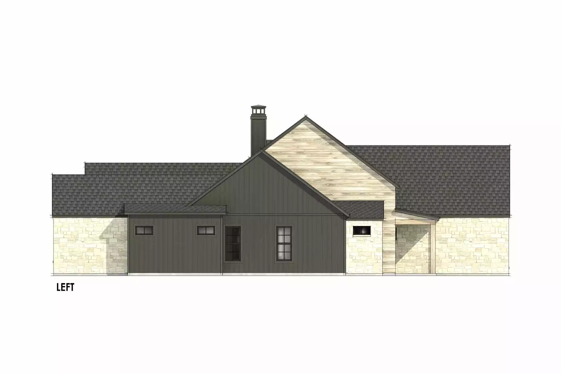 If you're looking for a modern farmhouse with plenty of rustic character, give House Plan 9198 your consideration! This beautiful design features mixed siding including stone and wood, so it definitely strikes a rugged tone. Inside, you'll find 3,028 square feet with an office to the side of the foyer that leads into the vaulted great room. With completely clear sightlines from the spacious U-shaped island kitchen to the fireplace in the living area, this space is perfect for gathering. You'll find four bedrooms split across the central common areas. The primary suite boasts a vaulted ceiling in the bedroom and another in its five-piece bath. It also has a walk-in closet that connects to the laundry room and mudroom coming in from the garage on the other side. Three more bedroom suites are across the house, in two hallways to define guest quarters from kids' quarters, if you like. A large covered back porch rounds out this amazing one-story home!