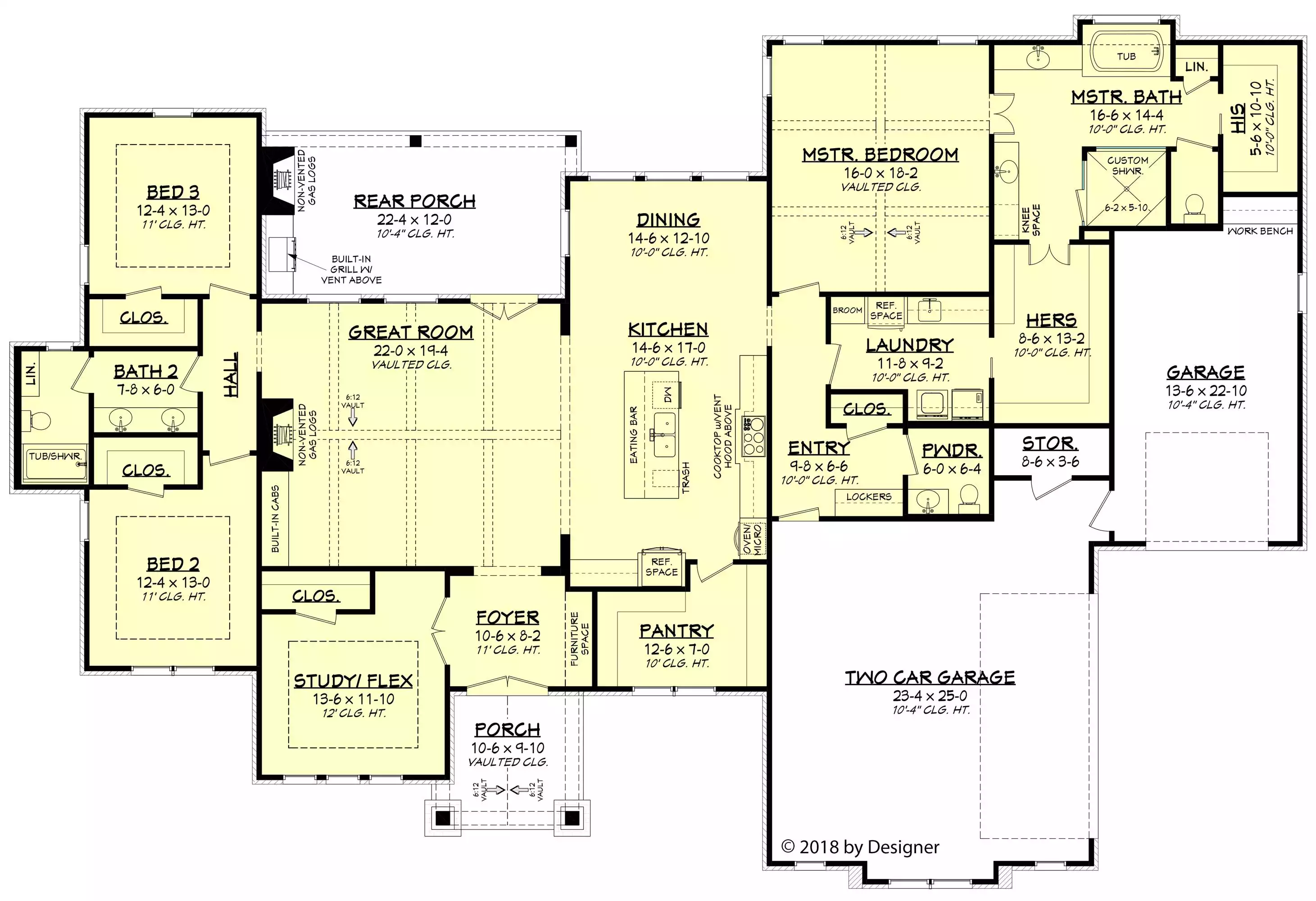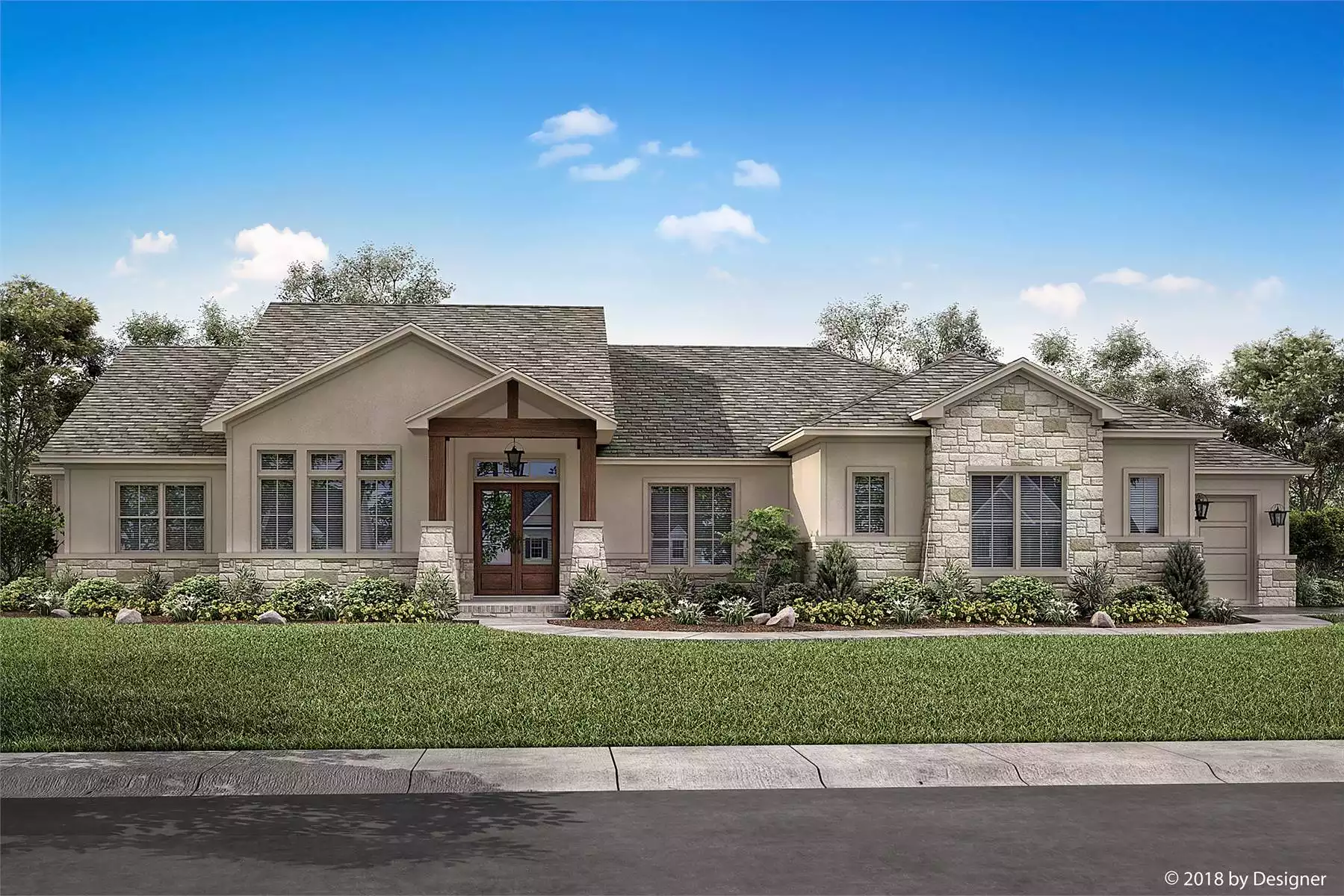 If you're on the hunt for a rustic ranch with a sprawling layout and a touch of Mediterranean flair, give House Plan 11472 a try! This 2,920-square-foot design offers three split bedrooms and two-and-a-half baths among its many charms. The thoughtful floor plan welcomes you in with a foyer with space for your favorite storage furniture and access to a study/flex room behind French doors. The great room fills out the center of the house next, with a super spacious living area beneath a cathedral vaulted ceiling with decorative beams. The L-shaped island kitchen overlooks the great room and sits beside the sunny dining area. Make sure not to miss the huge walk-in pantry! The hallway off the kitchen is where you'll find the primary suite, complete with a vaulted beamed ceiling in the bedroom, a five-piece bath, and dual walk-in closets. The laundry room, powder room, and mudroom that connects to the garage are also placed in this hall. Clear across the house, the secondary bedrooms both have trayed ceilings and walk-in closets, and they share a hall bath. Looking for outdoor living? The covered back porch has an outdoor fireplace and a built-in grill with a vent for cozy dining al fresco!