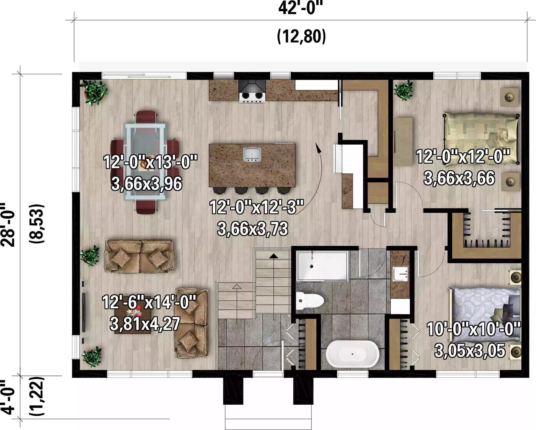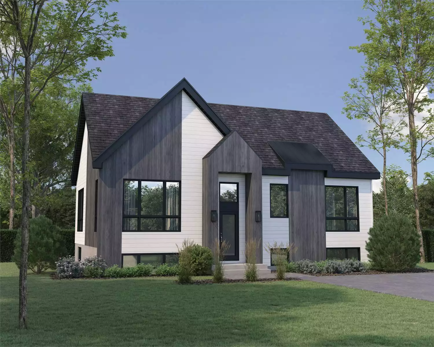 Perfect for those looking for a neat little home for year-round or vacation living, House Plan 10183 offers 1,176 square feet with two bedrooms and one bathroom in an affordable rectangular footprint. When you first enter, there's a coat closet in the foyer area. The main level is raised up from the entry landing while the stairs down lead to the unfinished basement. The common areas are open-concept and include an L-shaped island kitchen with a walk-in pantry overlooking the dining and living areas. Both bedrooms and the shared four-piece bathroom are in the side hallway.