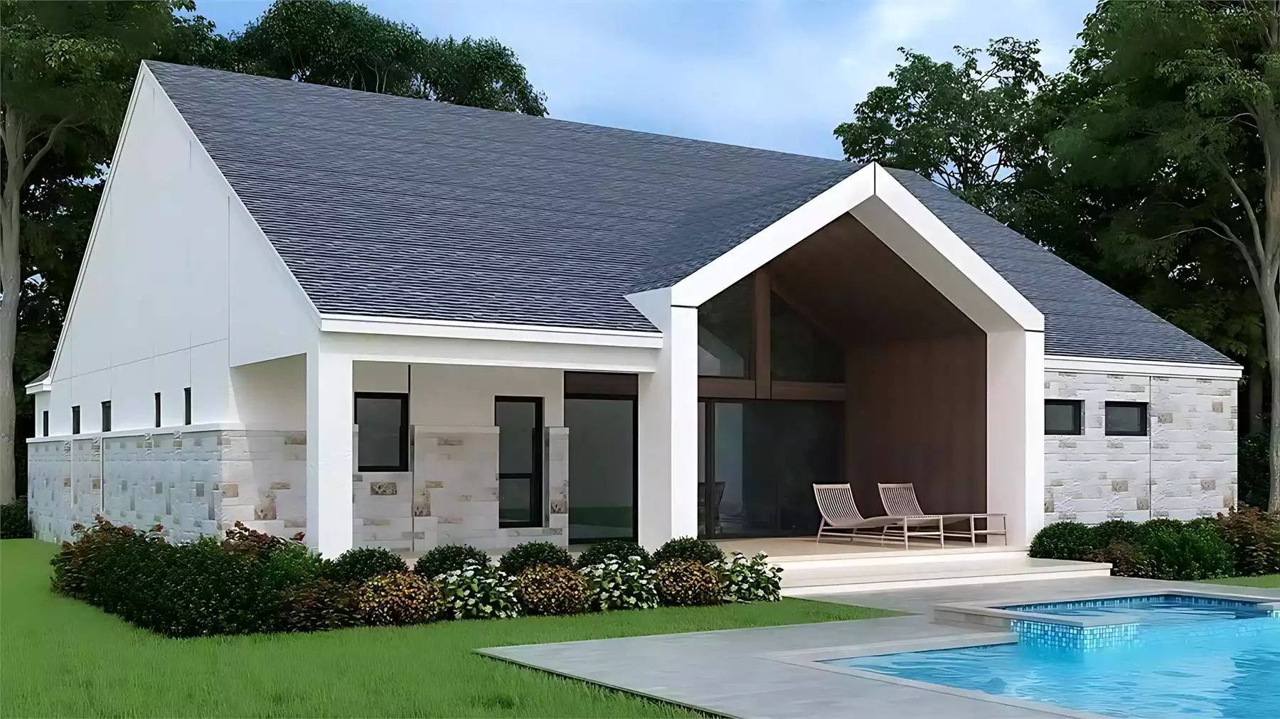With its sleek Scandinavian style, House Plan 2337 is here to brighten your life with transitional European charm! This 2,571-square-foot ranch offers four bedrooms and three bathrooms along with other thoughtful and breathtaking design features. Step inside and the long foyer has a vaulted ceiling above as it leads back. But first, you'll find the secondary bedrooms up front, with one beside a hall bath on the left and two in a Jack-and-Jill arrangement on the right, along with the laundry room. The great room in back has an open-concept layout with a cathedral sloped ceiling that continues out over the back porch through the slideaway patio doors. Make sure to appreciate the U-shaped island kitchen on the side with its classy beamed ceiling! The hallway off the great room and behind the two-car garage hosts the mudroom, of course, as well as an office and the luxurious primary suite. Between the beamed coffered ceiling and a five-piece bath with a walk-in closet, this retreat is made to please!