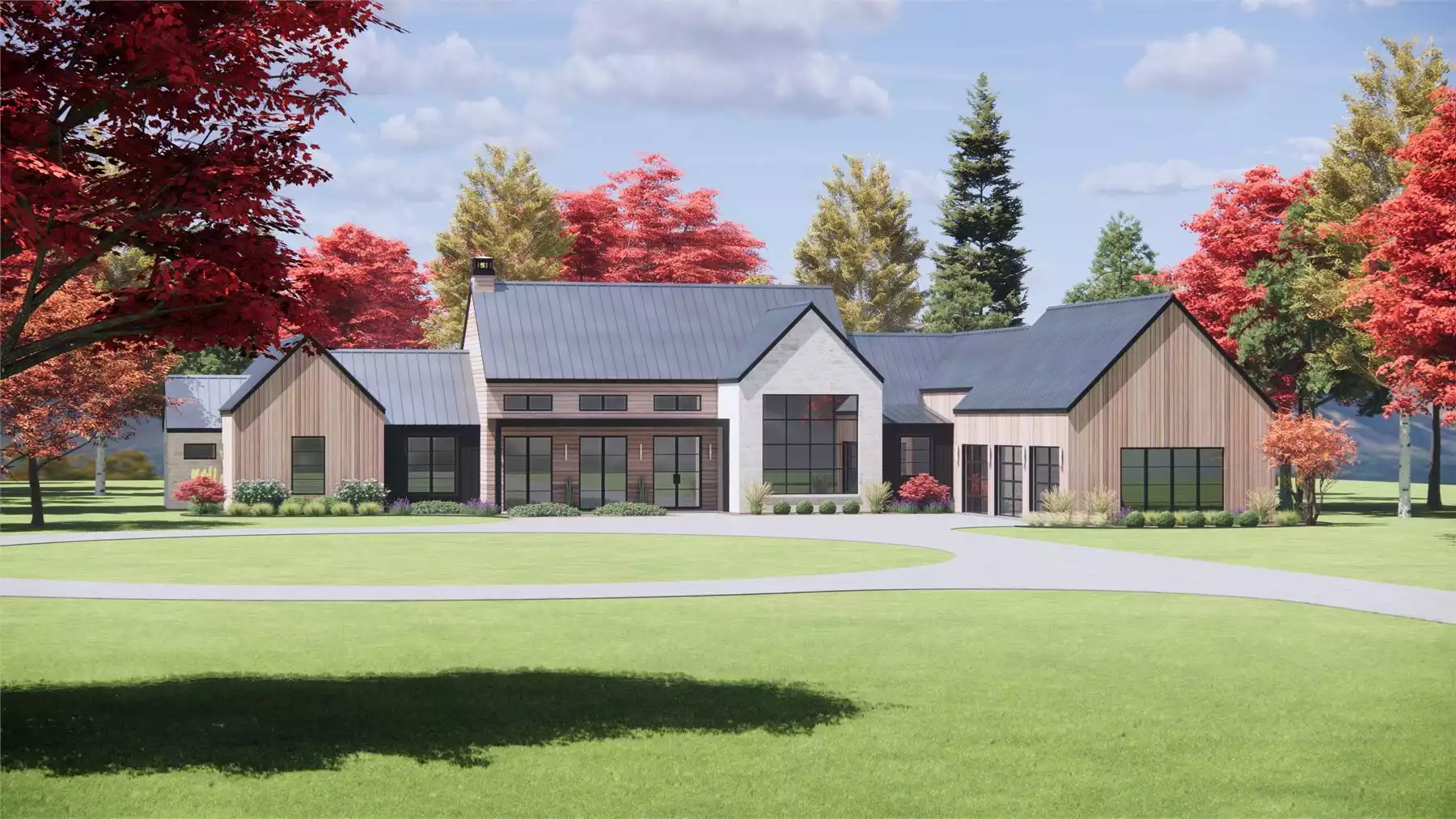 If you need a sprawling modern farmhouse with some Scandinavian flair, take a look at House Plan 6886! This 3,854-square-foot design spreads all its main spaces across one level, but there is a bonus room over the garage for more flexibility. A broad facade and courtyard garage placement create luxurious curb appeal while a dramatic interior with vaulted ceilings over the living space and kitchen/dining are sure to impress, too. The primary suite is placed down a hallway that also includes the gym/office and powder room. A vaulted bedroom, five-piece ensuite bath with a Euro-style tub/shower layout, and an absolutely massive walk-in closet will serve the owner(s) in style. The other three bedroom suites are on the opposite side of the house, with two in the back hallway and one off the hall that connects the mudroom to the walk-in pantry, laundry, and kitchen. What a great layout for families who like to host!
