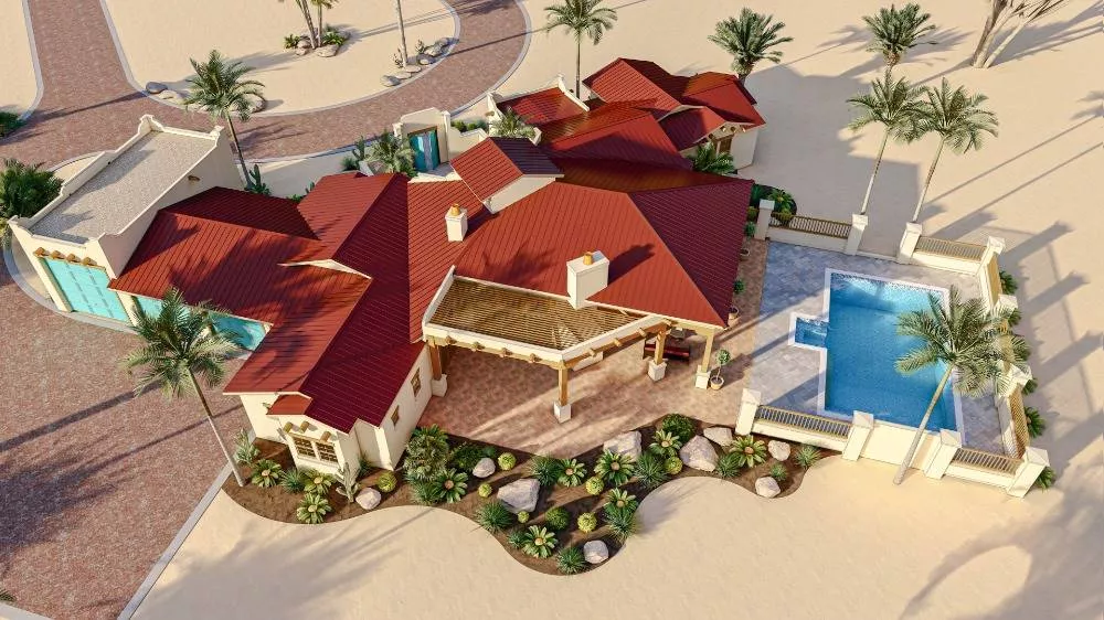 A larger version of our most popular Southwestern designs, House Plan 9887 is a sprawling V-shaped ranch offering 2,945 square feet, three bedrooms, and two-and-a-half bathrooms. But the extra square footage isn't the only major difference--it also has an RV bay beside the regular two-car garage! This unique layout welcomes you in with a spacious enclosed courtyard. Inside, the foyer connects to the beautiful beamed great room with a corner fireplace between two walls of windows straight ahead. To the right, you'll find the hallway with the primary suite, powder room, and mudroom/laundry room that attaches to the rear-entry angled side garage. Make sure to appreciate the luxury afforded by this suite with its corner fireplace, beamed ceiling, and grand five-piece bath! Take a left from the foyer and you'll come to the dining area, L-shaped island kitchen, and game/flex space. The hallway off this area is where you'll find the office and two bedrooms that share a Jack-and-Jill bath to complete the floor plan. But again, that's not all--don't overlook the amazing outdoor living space in back, complete with a BBQ kitchen, covered and open deck areas, and even an outdoor shower. This home is the perfect complement for sweeping views and a balmy outdoor- and travel-focused lifestyle!